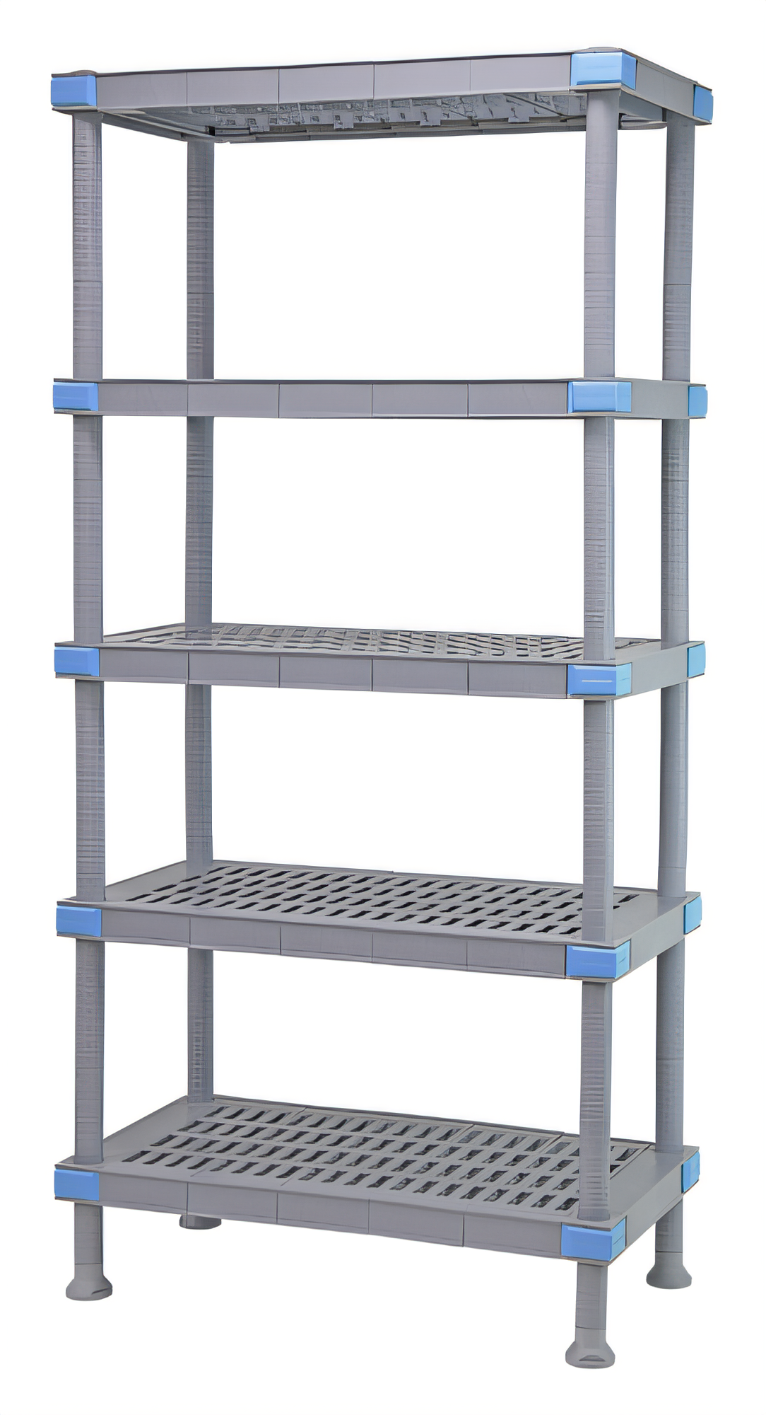 Millenia Shelving Unit, 30"W x 21"D x 86"H, up to 2000 lbs load capacity, includes: (5) open grid shelves with removable shelf mats and (4) posts, all polymer, rust proof, gray finish, NSF, Made in USA