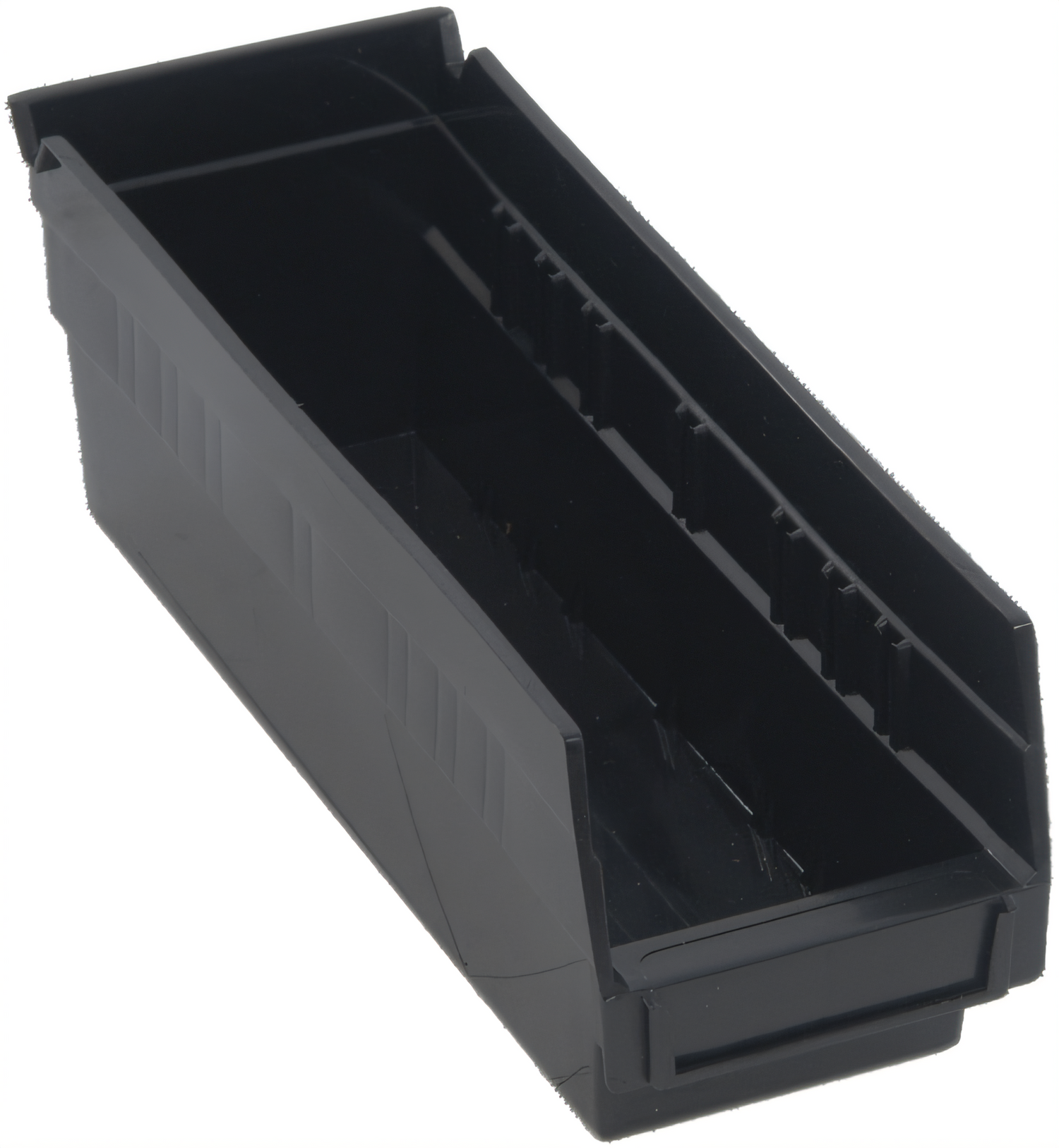 Economy Shelf Bin, nesting, conductive, 11-5/8"W x 4-1/8"D x 4"H, (7) divider slots, rear hanglock, molded-in label holder, polypropylene, black, Made in USA, (Must be purchased in multiple of 36)