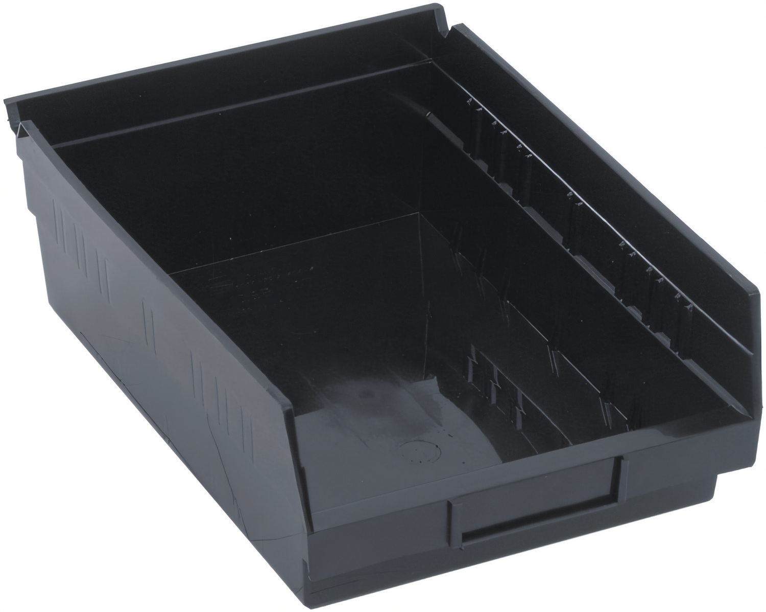 Economy Shelf Bin, nesting, 11-5/8"W x 8-3/8"D x 4"H, (7) divider slots, rear hanglock, molded-in label holder, recycled polypropylene, black, Made in USA, (Must be purchased in multiple of 20)