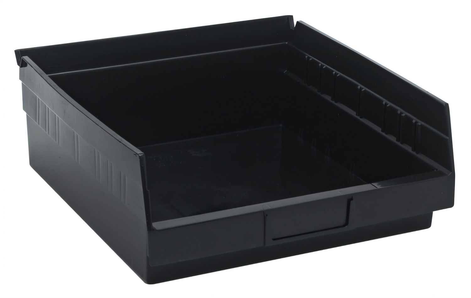 Economy Shelf Bin, nesting, conductive, 11-5/8"W x 11-1/8"D x 4"H, (7) divider slots, rear hanglock, molded-in label holder, polypropylene, black, Made in USA, (Must be purchased in multiple of 8)
