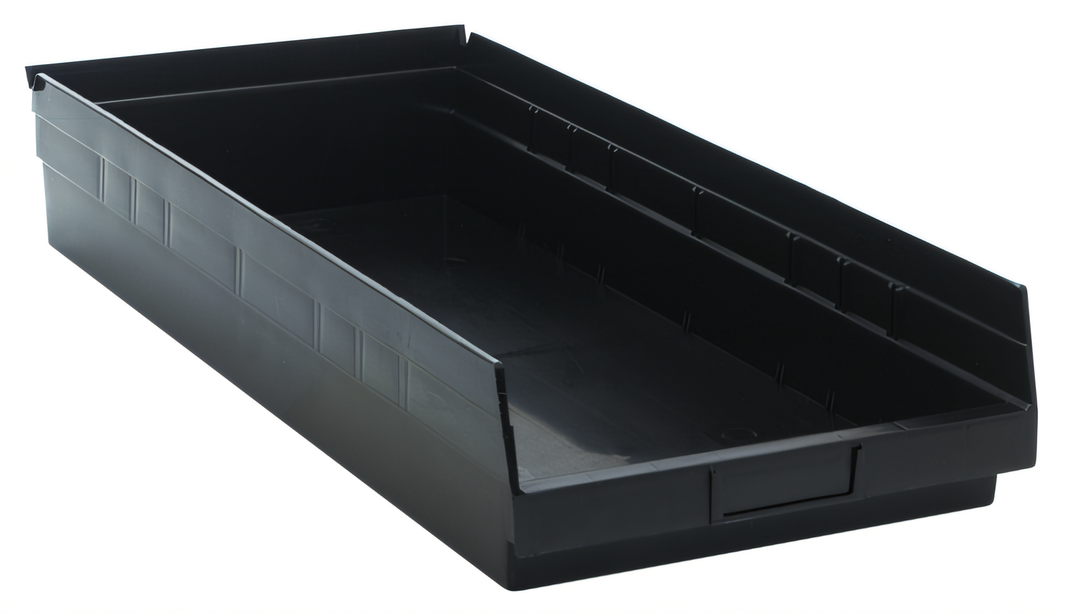 Economy Shelf Bin, nesting, 23-5/8"W x 11-1/8"D x 4"H, (7) divider slots, rear hanglock, molded-in label holder, recycled polypropylene, black, Made in USA, (Must be purchased in multiple of 6)