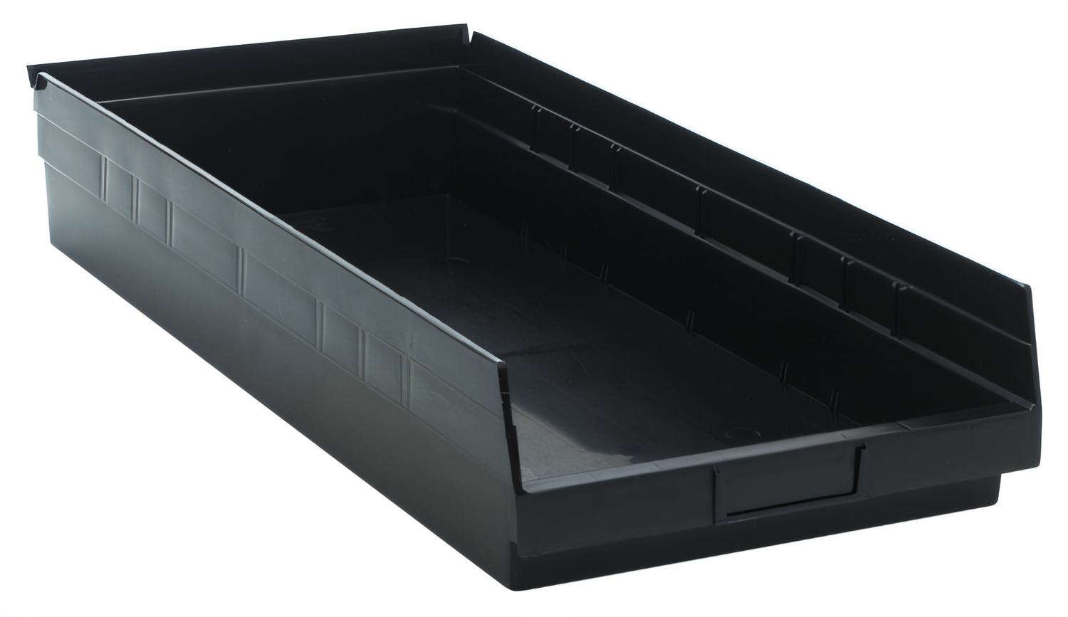 Economy Shelf Bin, nesting, conductive, 23-5/8"W x 11-1/8"D x 4"H, (7) divider slots, rear hanglock, molded-in label holder, polypropylene, black, Made in USA, (Must be purchased in multiple of 6)