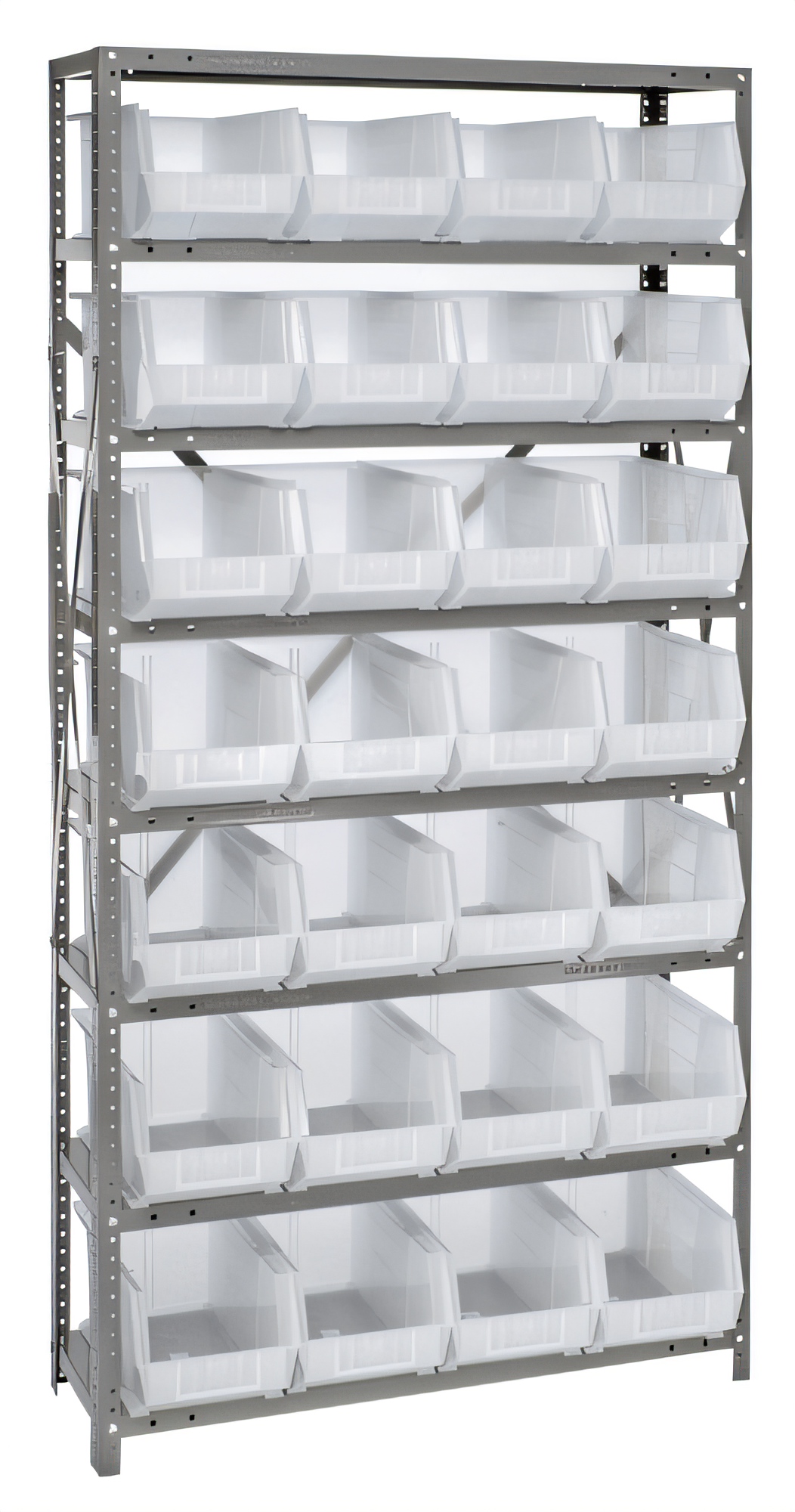 Shelving Unit, 12"D x 36"L x 75"H, heavy duty, 400 lb. load capacity per shelf, includes: (8) shelves and (28) QUS239 clear bins, uprights and cross bars, smooth powder coat finish