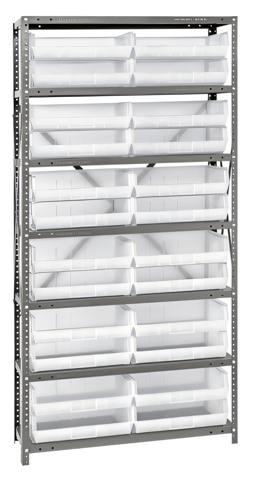 Shelving Unit, 12"D x 36"L x 75"H, heavy duty, 400 lb. load capacity per shelf, includes: (7) shelves and (24) QUS245 clear bins, uprights and cross bars, smooth powder coat finish