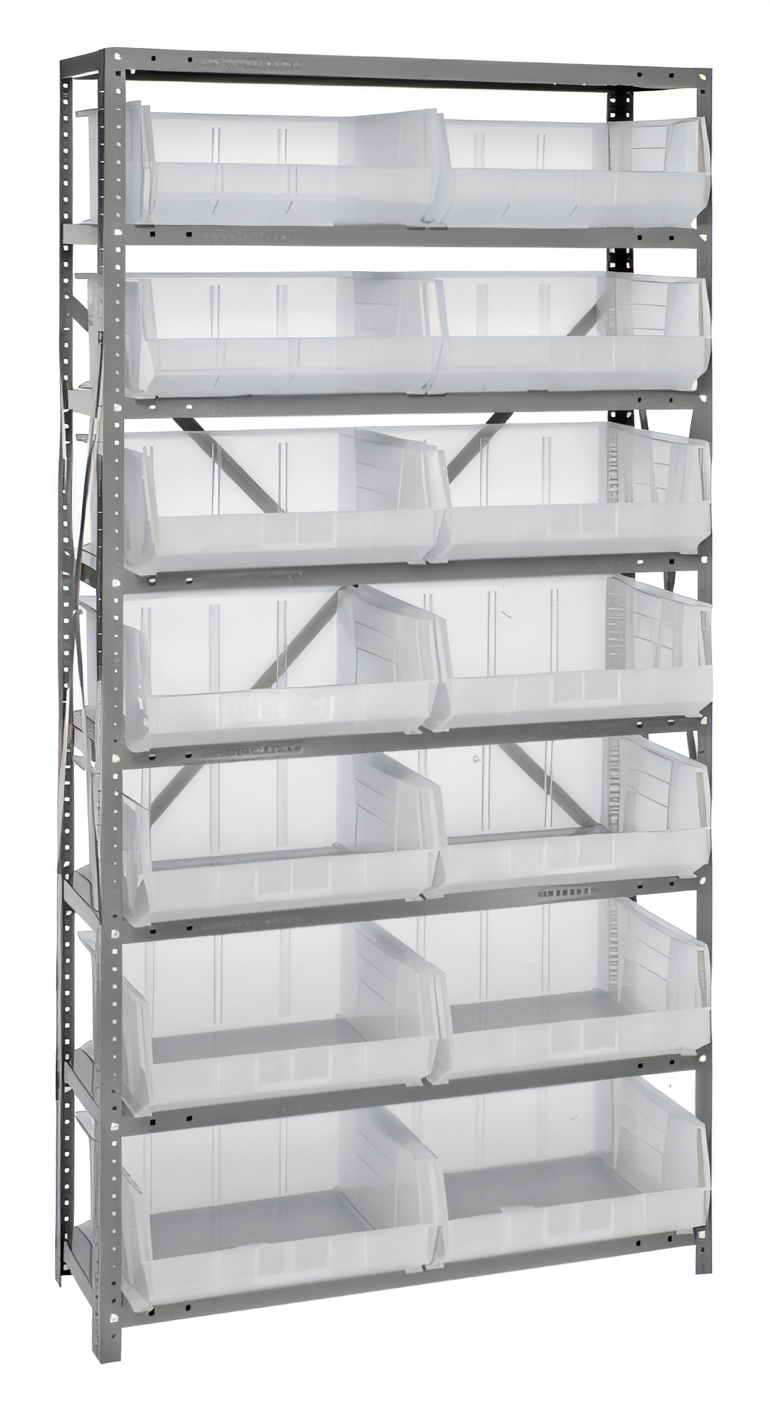 Shelving Unit, 12"D x 36"L x 75"H, heavy duty, 400 lb. load capacity per shelf, includes: (8) shelves and (14) QUS250 clear bins, uprights and cross bars, smooth powder coat finish