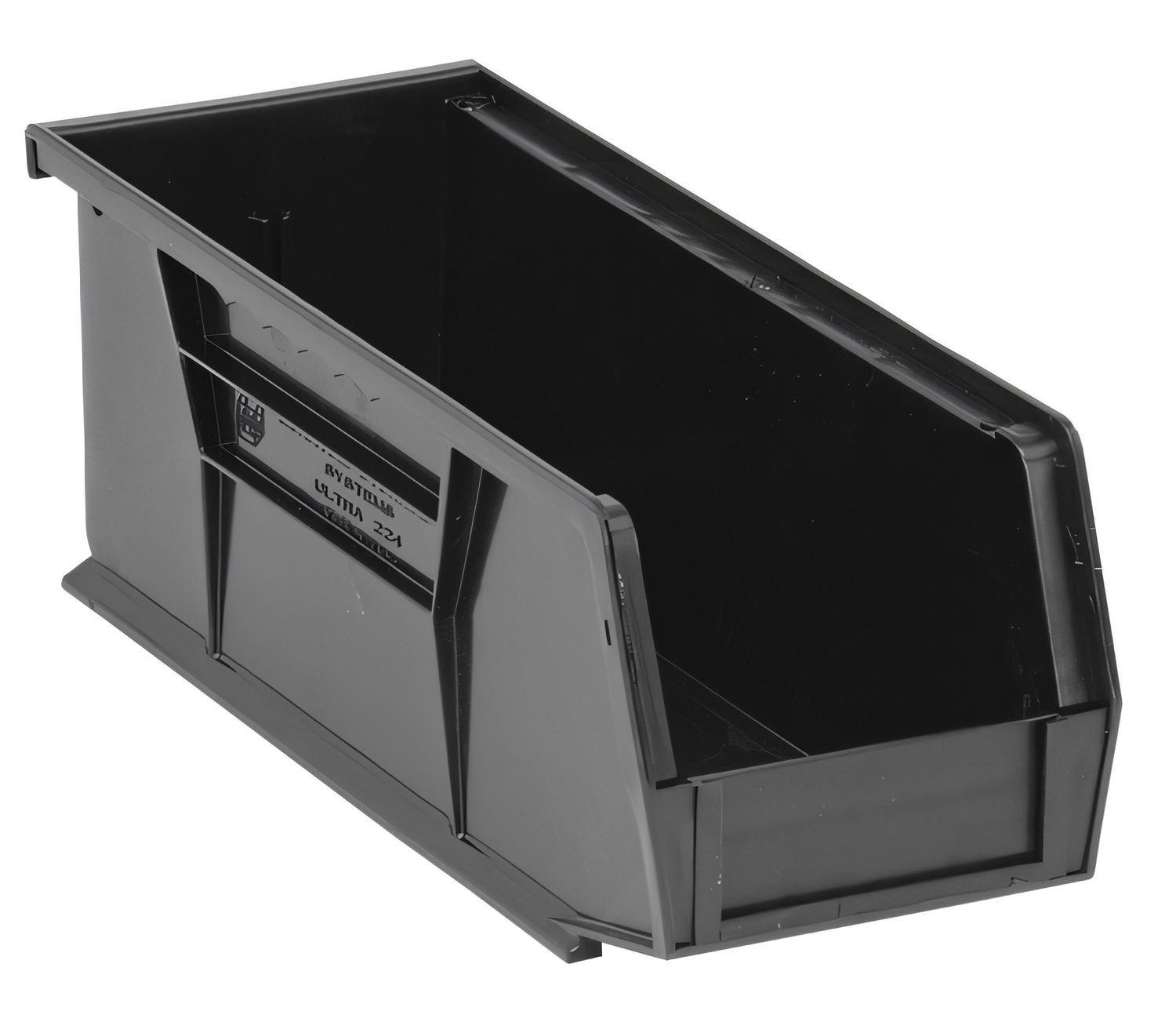 Bin, stacking or hanging, 4-1/8"W x 10-7/8"D x 4"H, front/back/side grips, anti-slide lock, (1) divider slot, rear hanger, molded-in label holder, recycled polypropylene, black, Made in USA, (Must be purchased in multiple of 12)