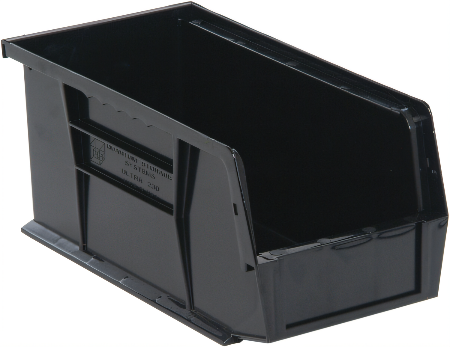 Bin, stacking or hanging, 5-1/2"W x 10-7/8"D x 5"H, front/back/side grips, anti-slide lock, (1) divider slot, rear hanger, molded-in label holder, recycled polypropylene, black, Made in USA, (Must be purchased in multiple of 12)
