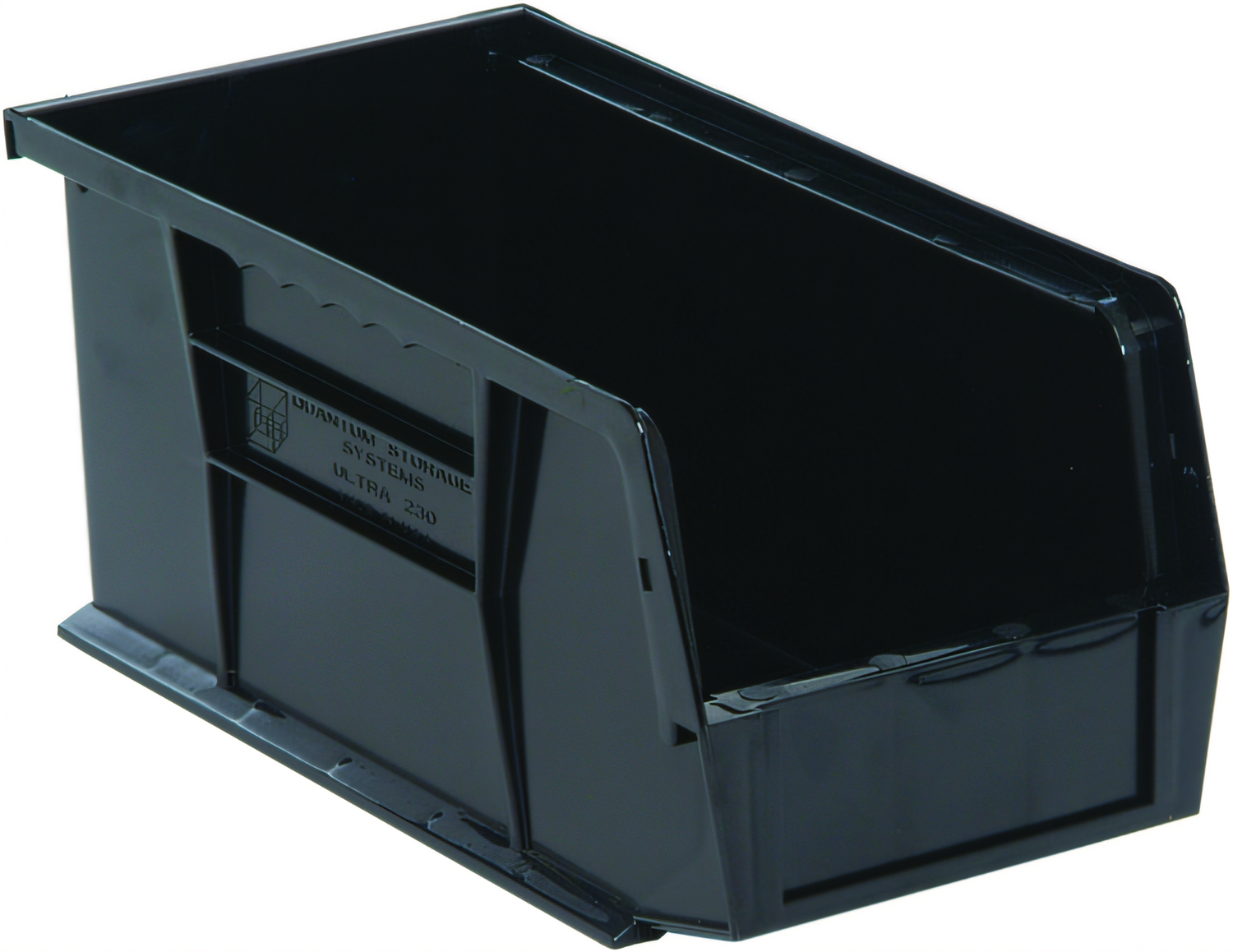 Bin, stacking or hanging, conductive, 5-1/2"W x 10-7/8"D x 5"H, front/back/side grips, anti-slide lock, (1) divider slot, rear hanger, molded-in label holder, black, Made in USA, (Must be purchased in multiple of 12)