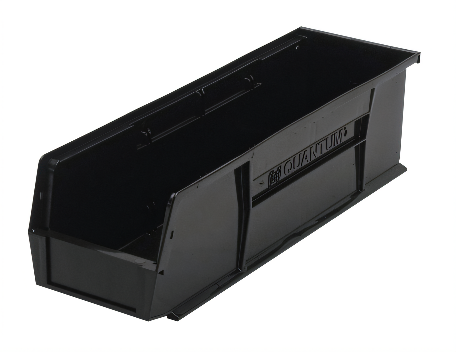 Bin, stacking or hanging, 5-1/2"W x 18"D x 5"H, front/back/side grips, anti-slide lock, (1) divider slot, rear hanger, molded-in label holder, recycled polypropylene, black, Made in USA, (Must be purchased in multiple of 12)