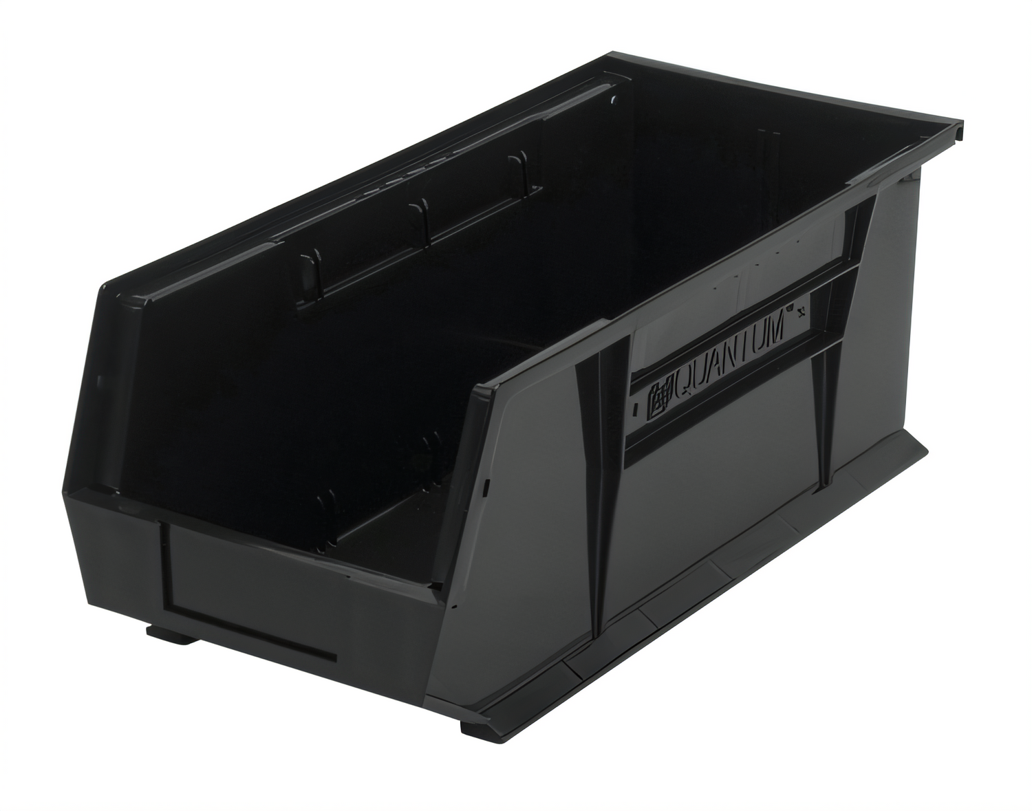 Bin, stacking or hanging, 8-1/4"W x 18"D x 7"H, front/back/side grips, anti-slide lock, (1) divider slot, rear hanger, molded-in label holder, recycled polypropylene, black, Made in USA, (Must be purchased in multiple of 6)