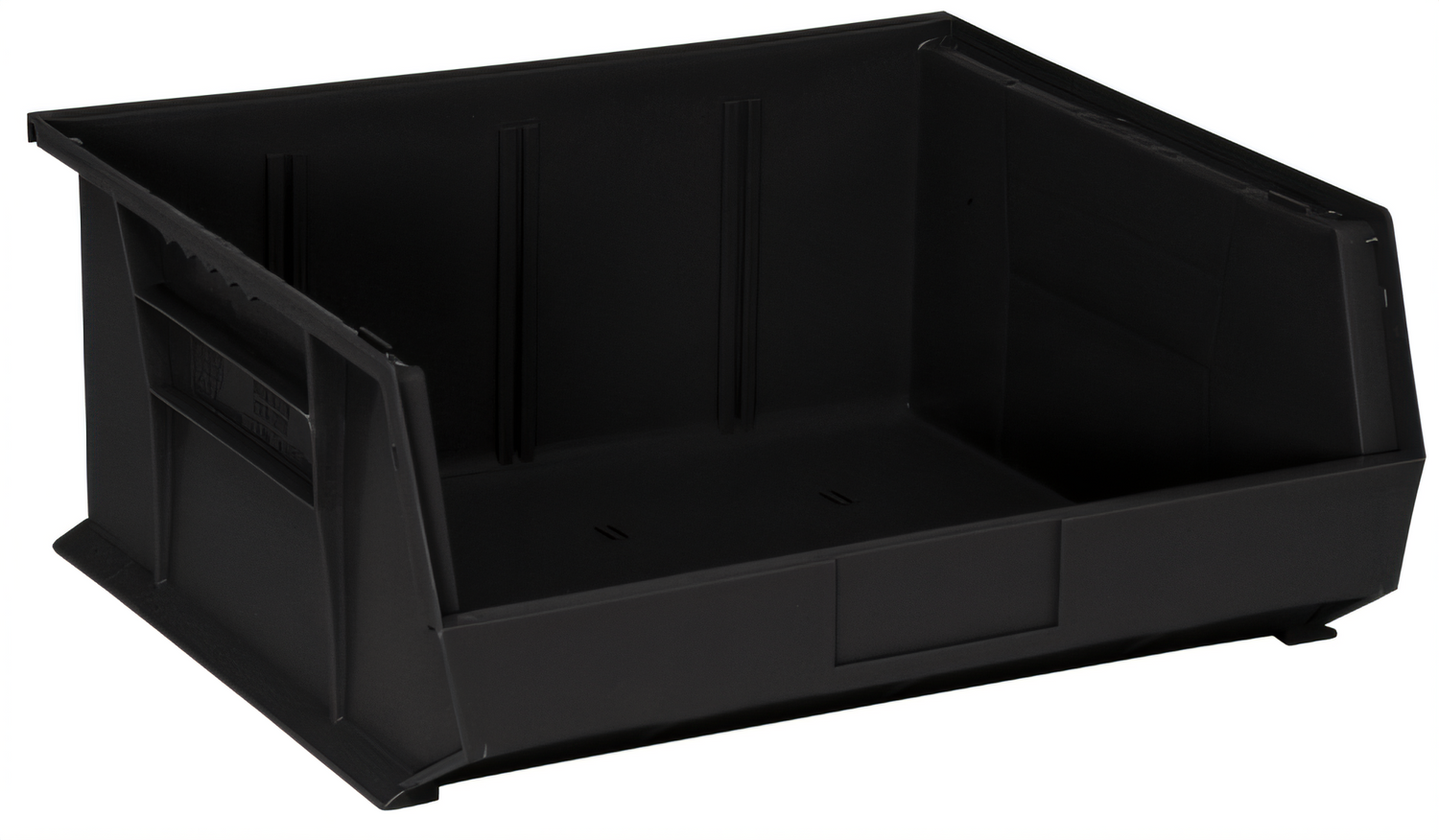 Bin, stacking or hanging, conductive, 16-1/2"W x 14-3/4"D x 7"H, front/back/side grips, anti-slide lock, (3) divider slots, rear hanger, molded-in label holder, black, Made in USA, (Must be purchased in multiple of 6)