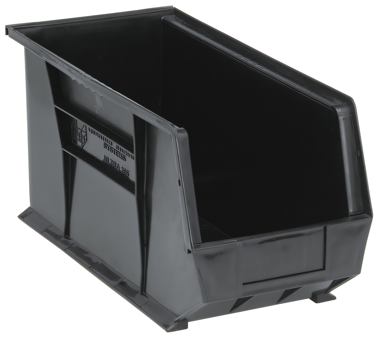 Bin, stacking or hanging, 8-1/4"W x 18"D x 9"H, front/back/side grips, anti-slide lock, (1) divider slot, rear hanger, molded-in label holder, recycled polypropylene, black, Made in USA, (Must be purchased in multiple of 6)