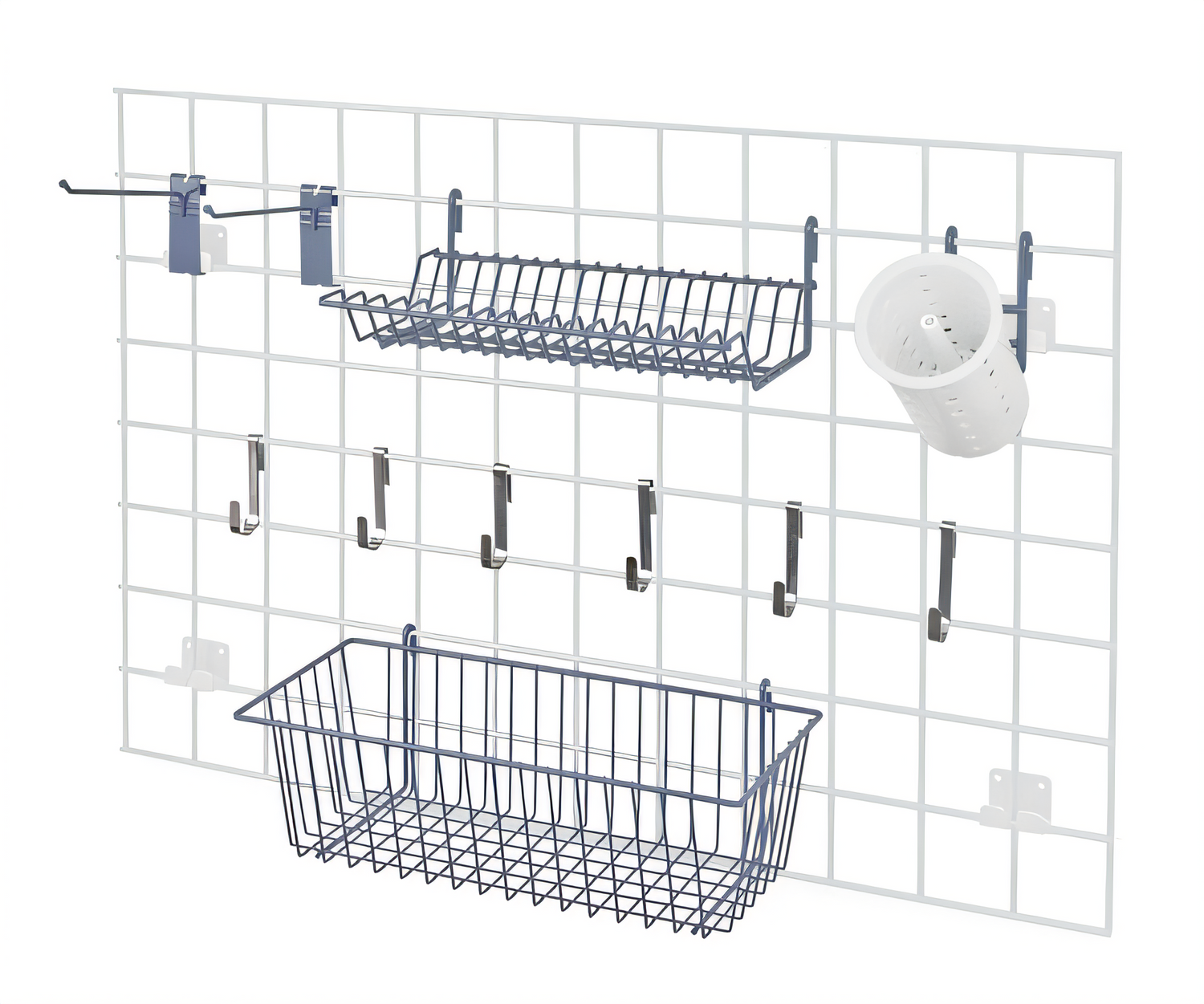 Store Grid Accessory Pack, includes: (1) 17"W x 7"D x 5"H basket, (1) lid holder drying rack, (1) cylinder holder, (1) flatware cylinder, (2) 6" hook and (6) small hook, gray epoxy antimicrobial finish, NSF
