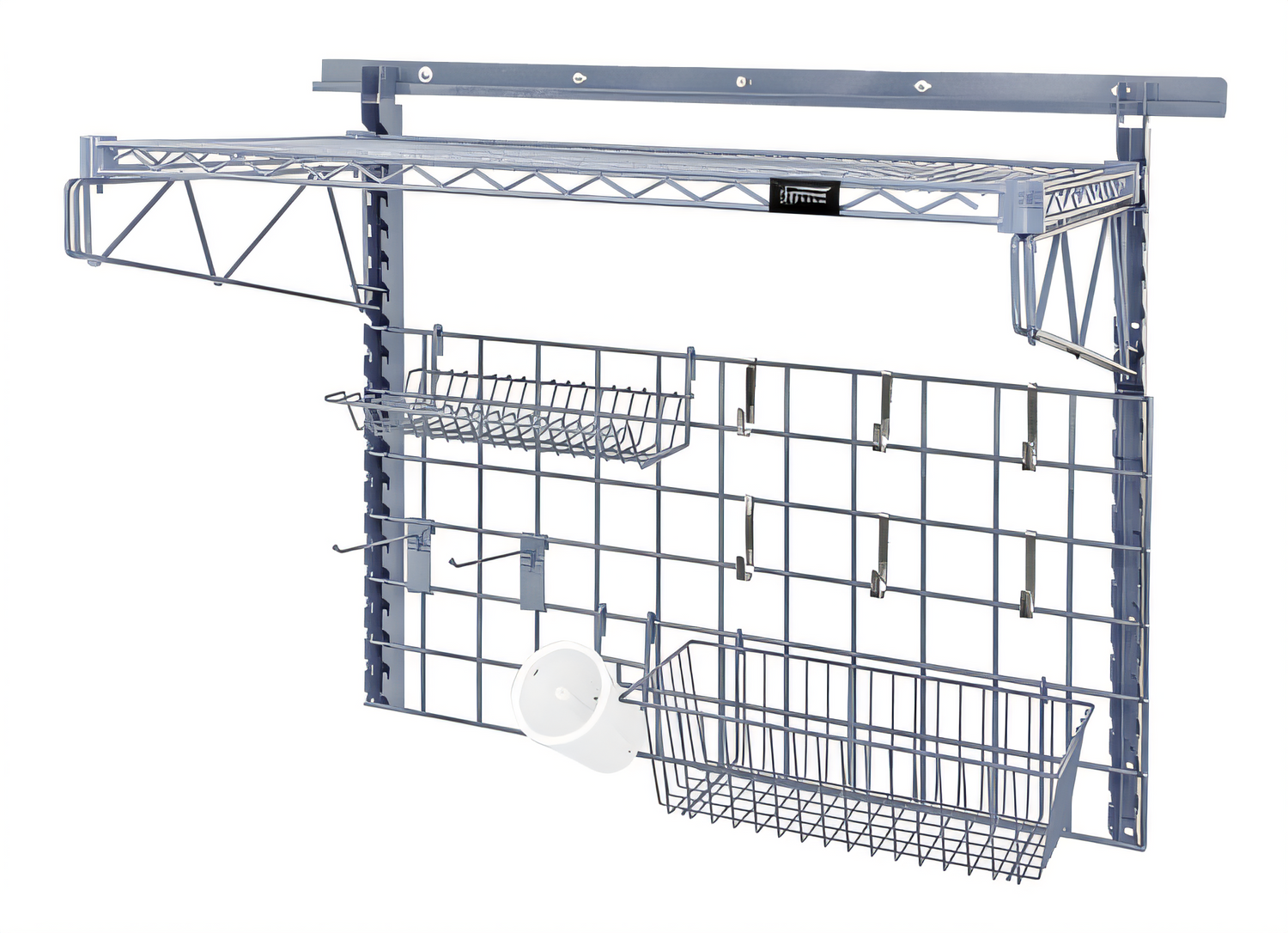 Store Grid Medium-Duty Kit, includes: (1) 40" wall track, (2) 31" upright, (2) 18" single cantilever arms, (1) 36"W x 18"D shelf (1836P), (1) 36"W x 18"H grid panel, (1) 17"W x 7"D x 5"H basket, (1) lid holder drying rack, (1) cylinder holder, (1) flatware cylinder, (2) 6" hook and (6) small hook, gray epoxy antimicrobial finish, NSF