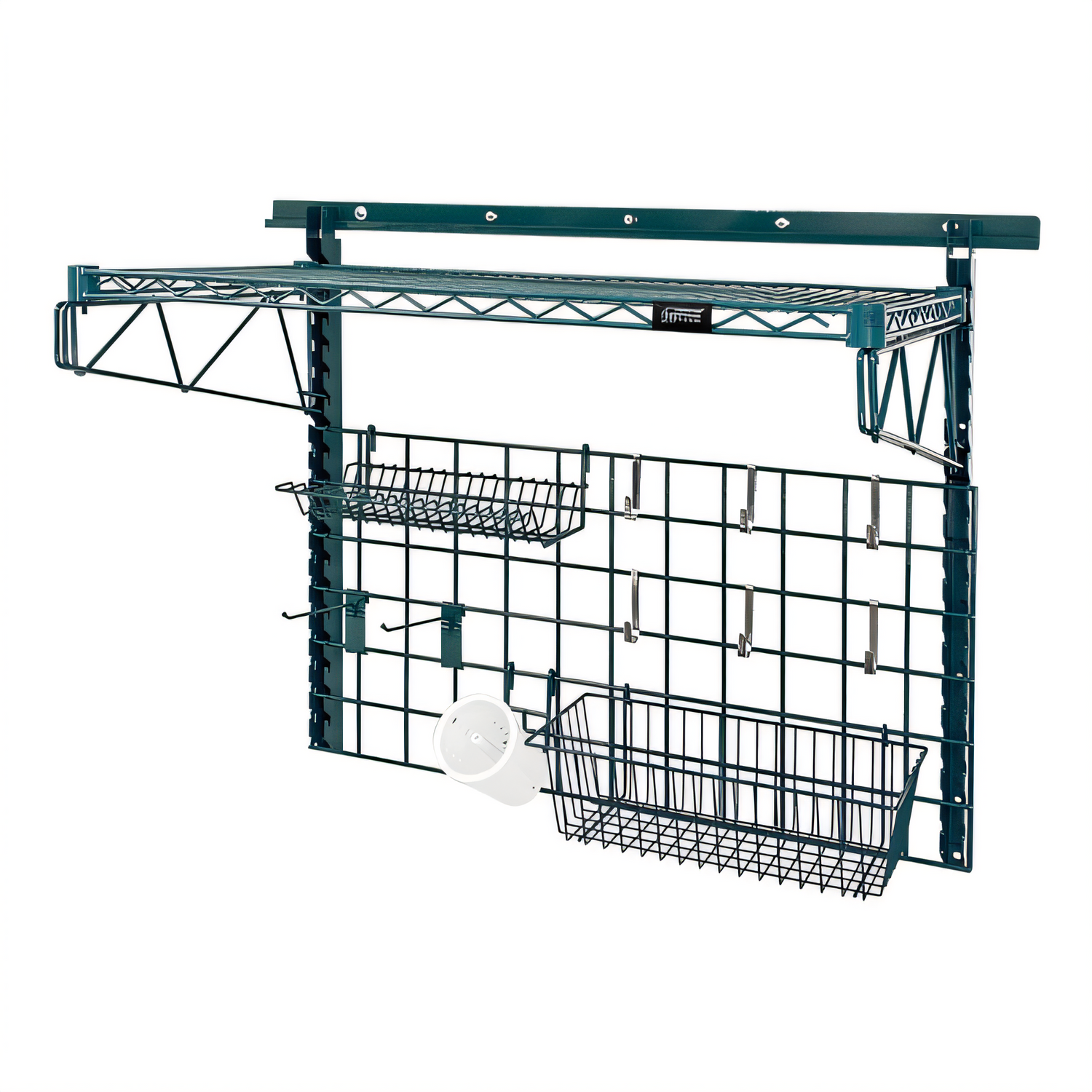Store Grid Medium-Duty Kit, includes: (1) 40" wall track, (2) 31" upright, (2) 18" single cantilever arms, (1) 36"W x 18"D shelf (1836P), (1) 36"W x 18"H grid panel, (1) 17"W x 7"D x 5"H basket, (1) lid holder drying rack, (1) cylinder holder, (1) flatware cylinder, (2) 6" hook and (6) small hook, green epoxy antimicrobial finish, NSF