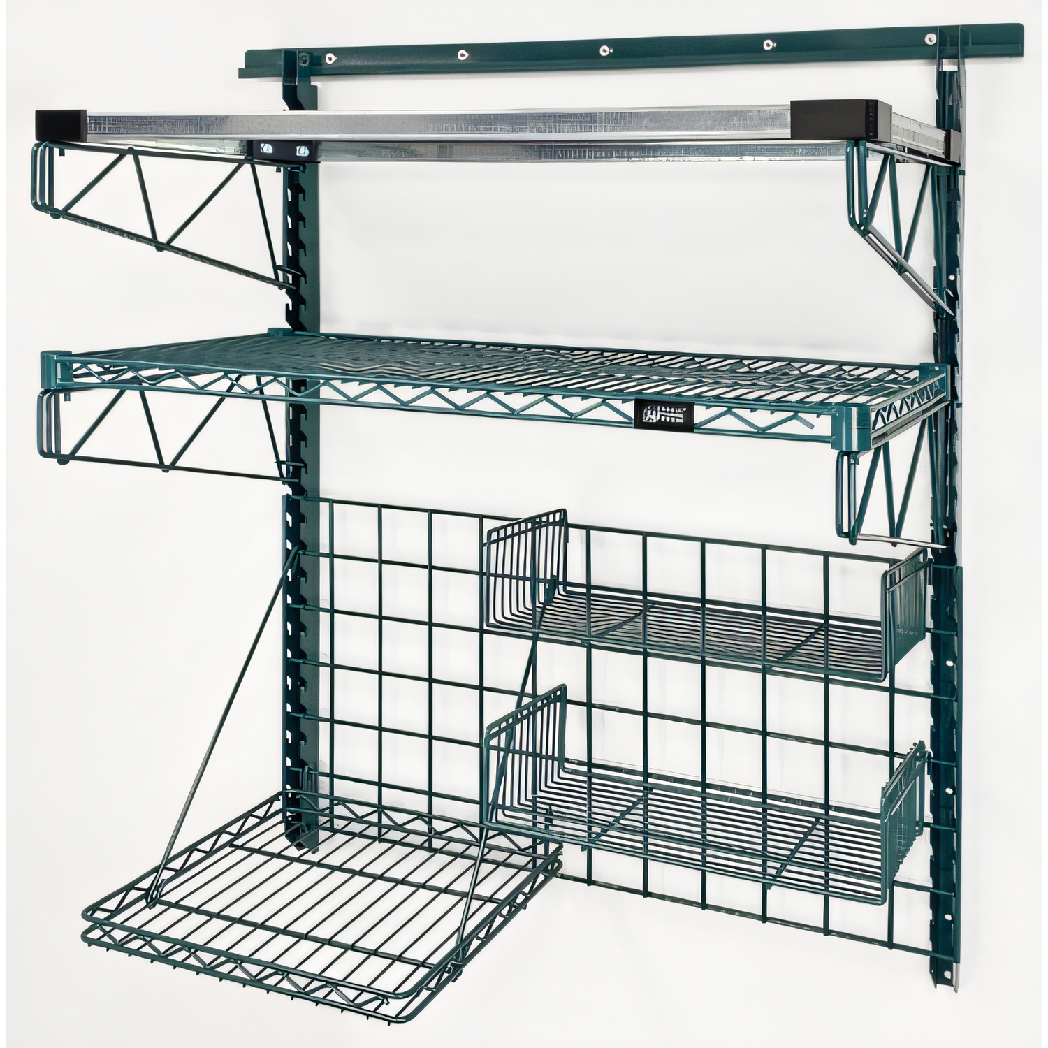 Store Grid Medium-Duty Kit, includes: (1) 40" wall track, (2) 44" uprights, (4) 18" single cantilever arms, (1) shelf (1836P), (1) galvanized steel shelf (1836SG), (1) 16"W x 16"D small shelf, & (1) 36"W x 18"H grid panel, green epoxy antimicrobial finish, NSF