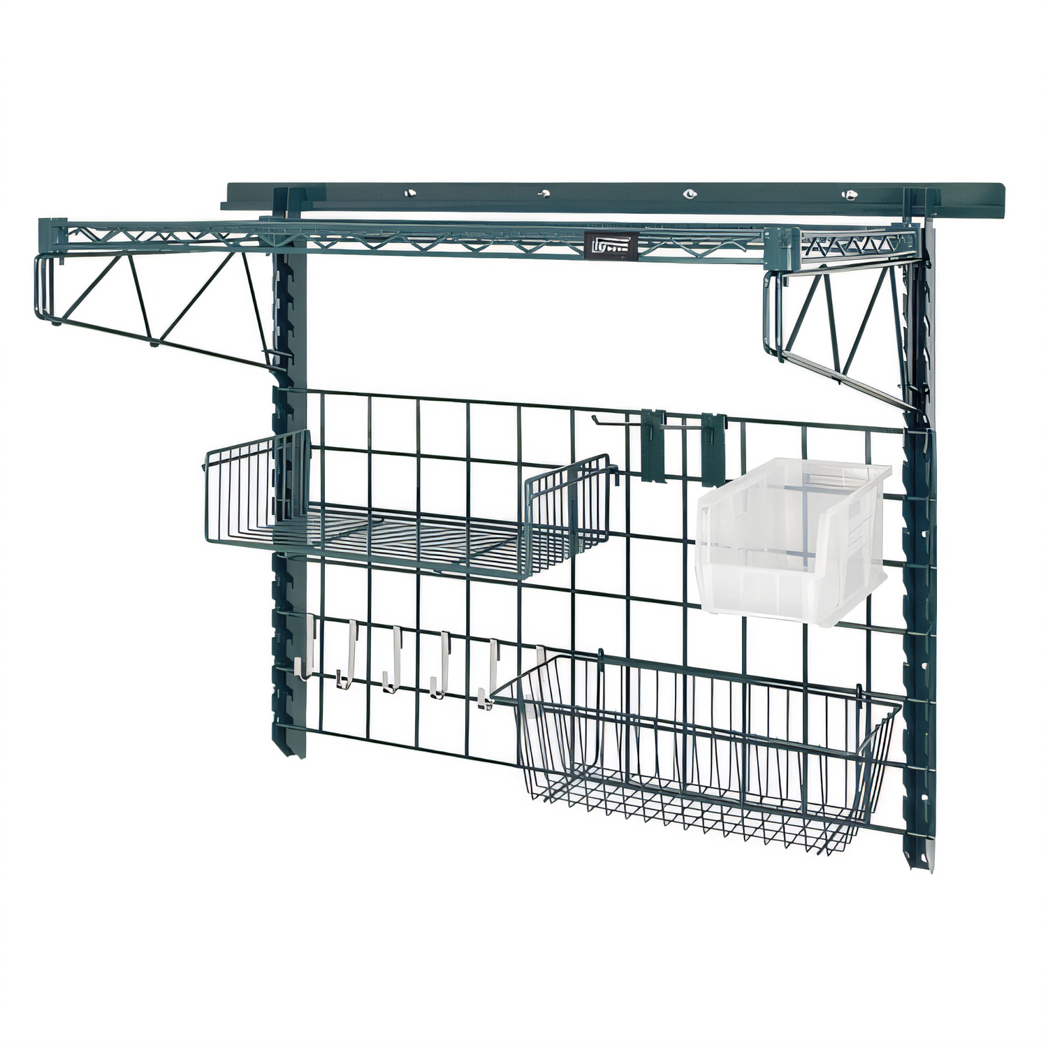 Store Grid Medium-Duty Kit, includes: (1) 40" wall track, (2) 31" upright, (2) 18" single cantilever arms, (1) 36"W x 18"D shelf (1836P), (1) 36"W x 18"H grid panel, (1) 17"W x 7"D x 5"H basket, (1) 18"W x 9"D small shelf, (2) 6" hooks, (6) small hooks, (1) single bin holder & (1) QUS230 clear bin, green epoxy antimicrobial finish, NSF