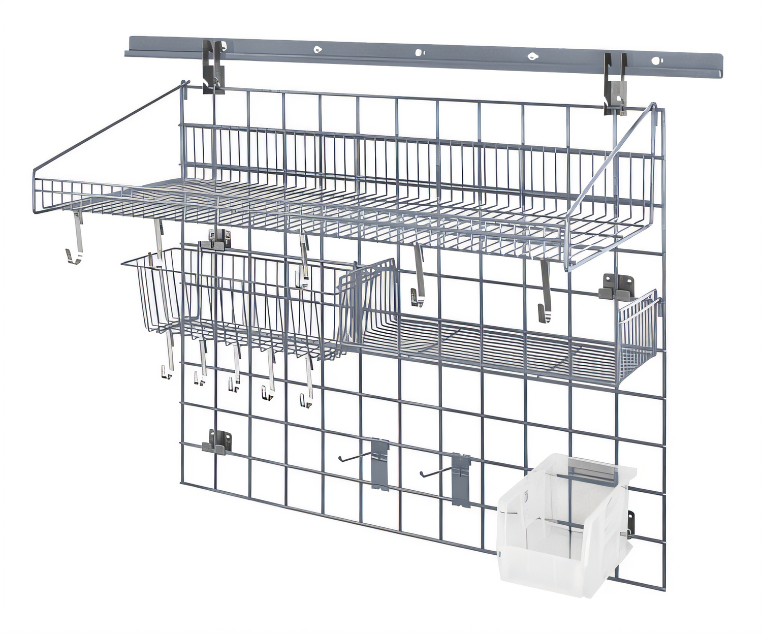 Store Grid Standard-Duty Kit, includes: (1) 40" wall track, (1) 36"W x 30"H grid panel, (1) 36"W x 18"D large shelf), (1) 17"W x 7"D x 5"H basket, (1) single bin holder, (1) QUS230 clear bin, and (1) wall tack mounting bracket, gray epoxy antimicrobial finish, NSF