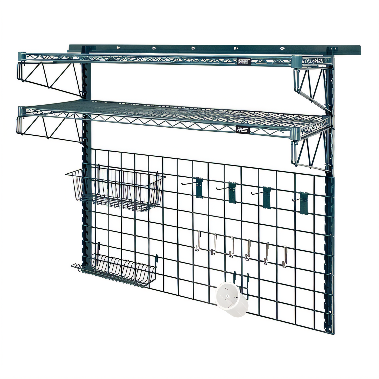 Store Grid Medium-Duty Kit, includes: (1) 56" wall track, (2) 44" uprights, (4) 18" single cantilever arms, (2) 36"W x 18"D shelves (1836P), (1) 48"W x 24"H grid panel, (1) 17"W x 7"D x 5"H basket, (1) lid holder drying rack, (4) 6" hooks, (6) small hooks, (1) cylinder holder & (1) flatware cylinder, green epoxy antimicrobial finish, NSF