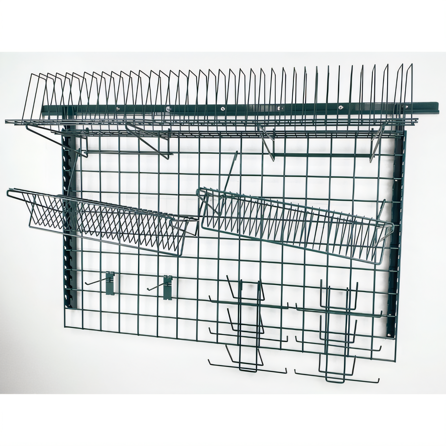 Store Grid Medium-Duty Kit, includes: (1) 56" wall track, (2) 31" uprights, (1) 48"W x 30"H grid panel, (1) 46"W x 14"D tray drying rack, (2) slanted tray drying racks, (2) bottle holders and (2) 6" hooks, green epoxy antimicrobial finish, NSF
