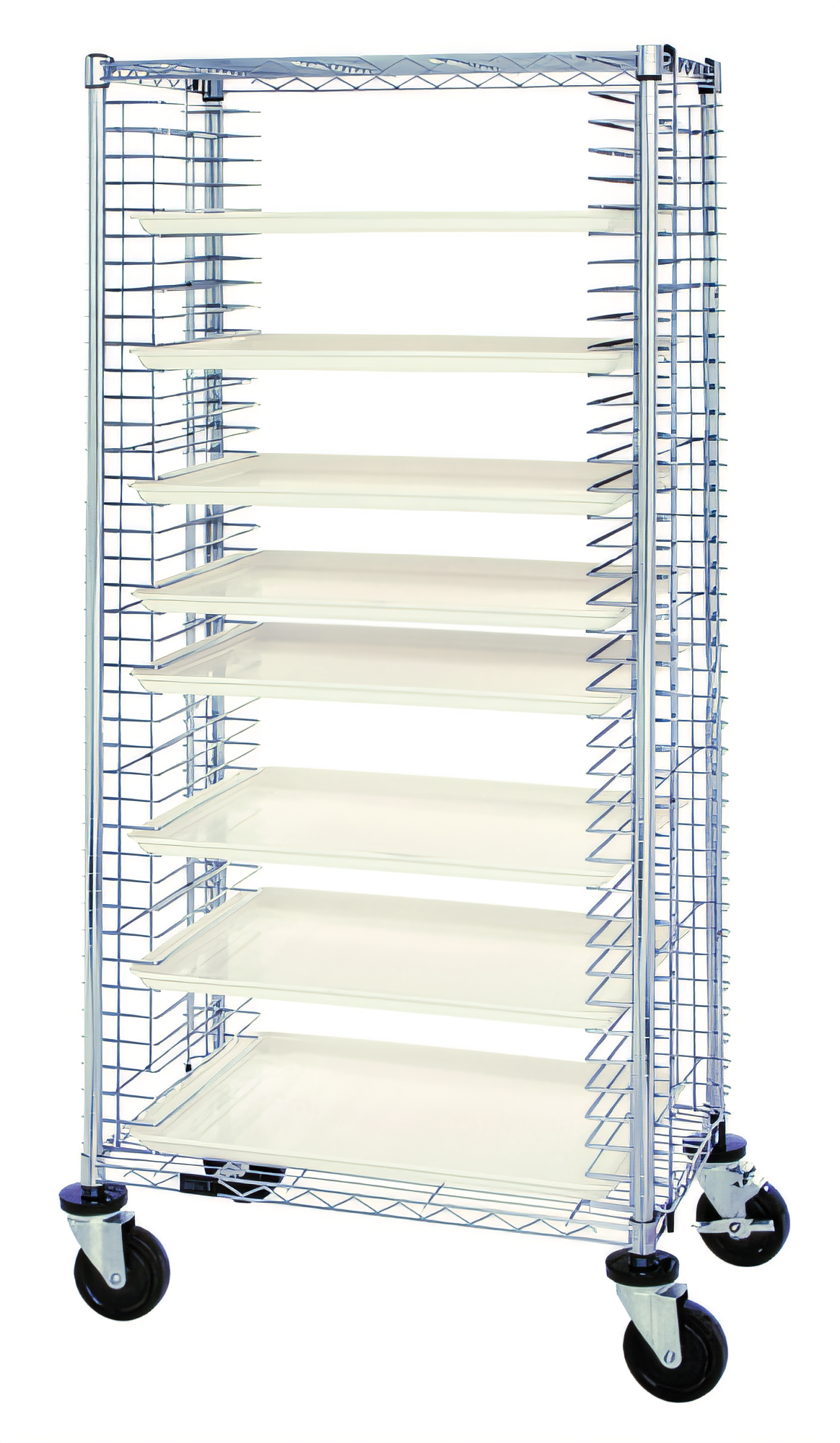 Tray Cart, mobile, full size, 30"W x 21"D x 69"H, side loading, holds (31) trays, casters, chrome plated finish, NSF