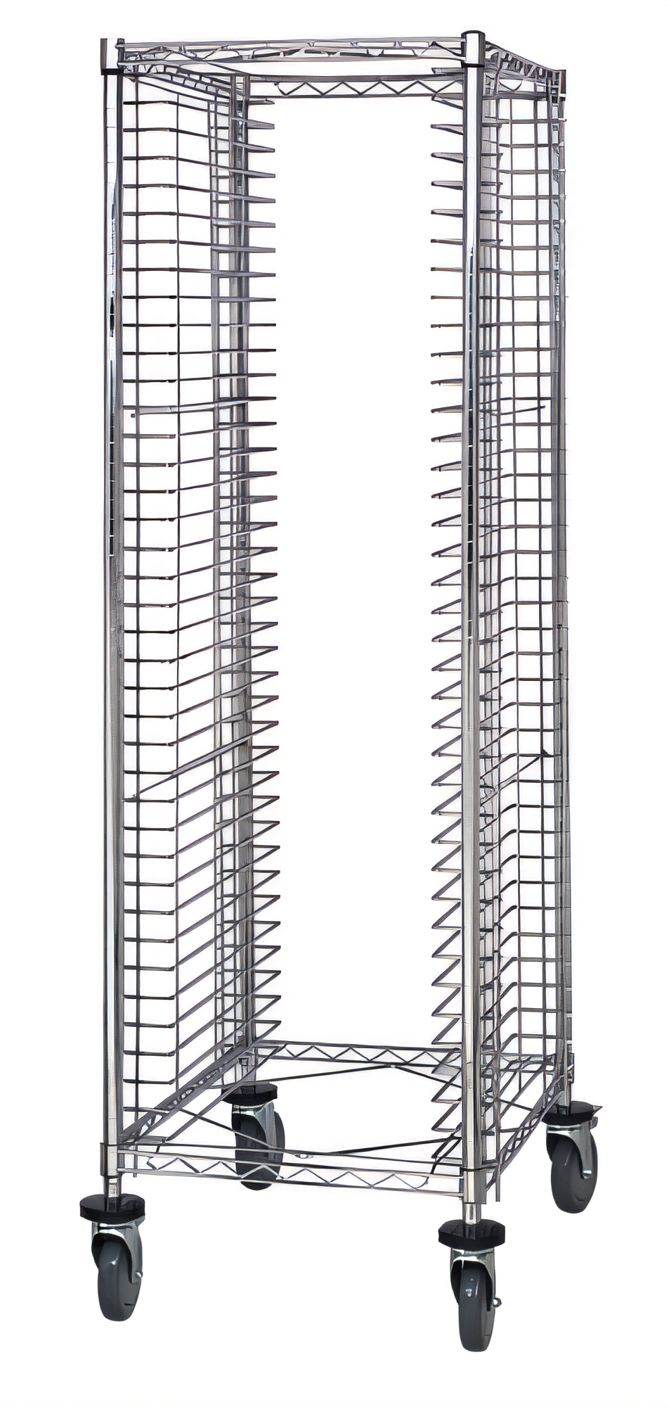 Tray Cart, mobile, conductive, full size, 27"W x 21-3/4"D x 69"H, end loading, holds (38) trays, casters, chrome plated finish
