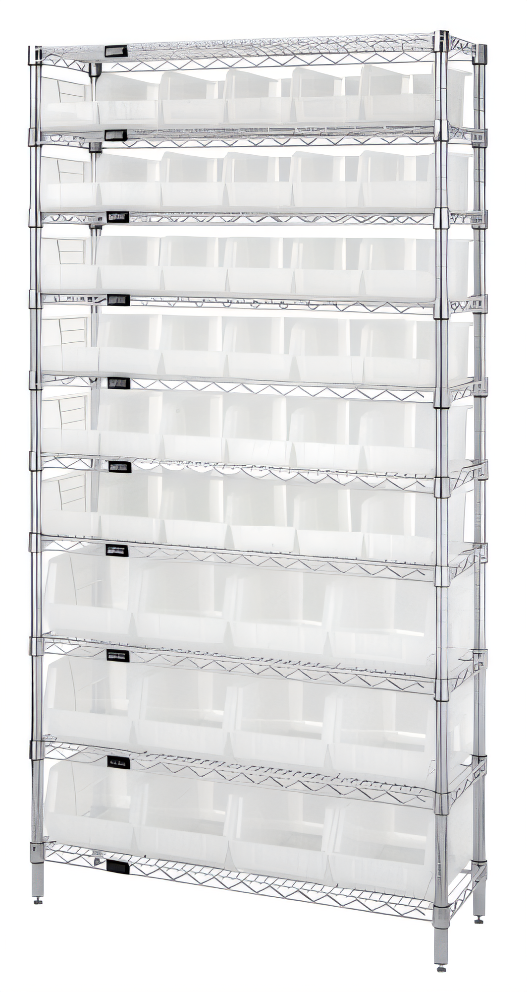 Bin System Unit, stationary, includes: (4) 74"H posts, (10) 36"W x 14"D wire shelves, (36) QUS230 and (12) QUS240 clear bins, chrome plated finish, shipped KD