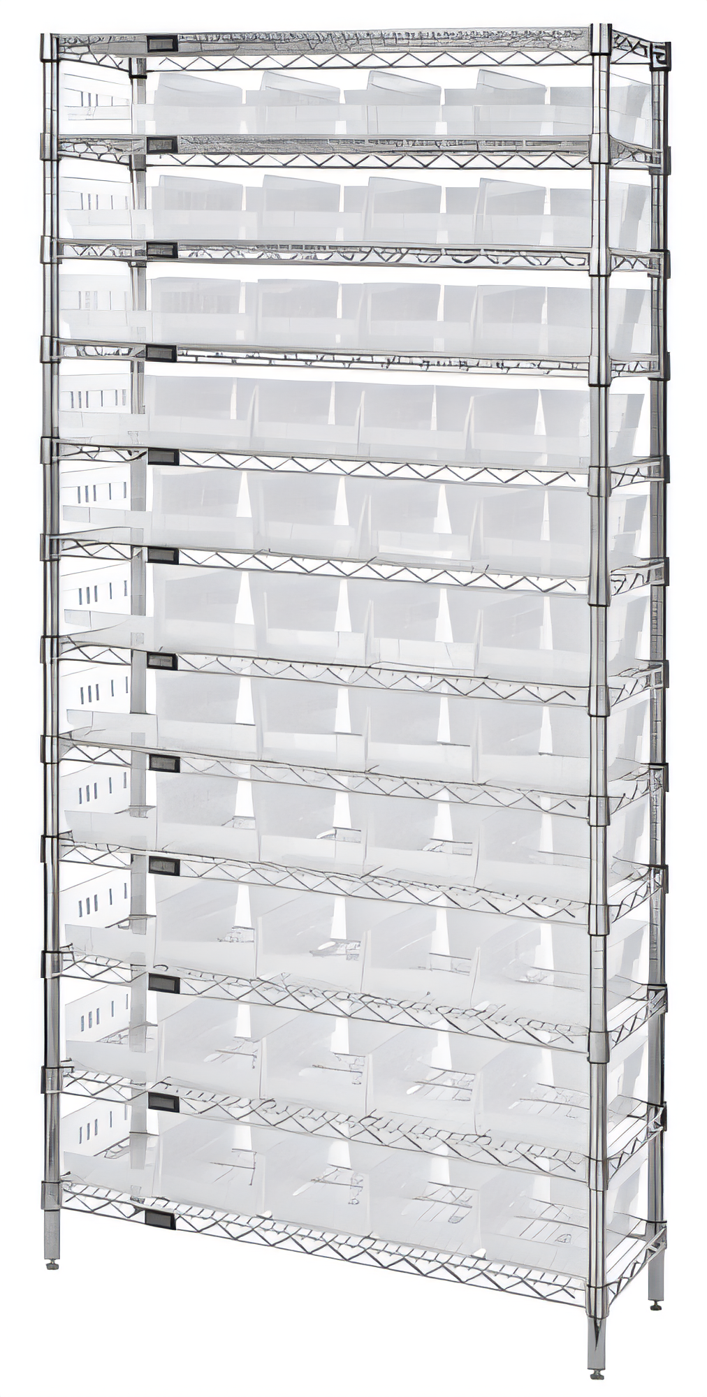 Bin Wire Shelving System, 36"W x 12"D x 74"H overall size, 800 lb. capacity per shelf, includes: (12) wire shelves, (4) posts, and (55) QSB102 clear bins, chrome plated finish