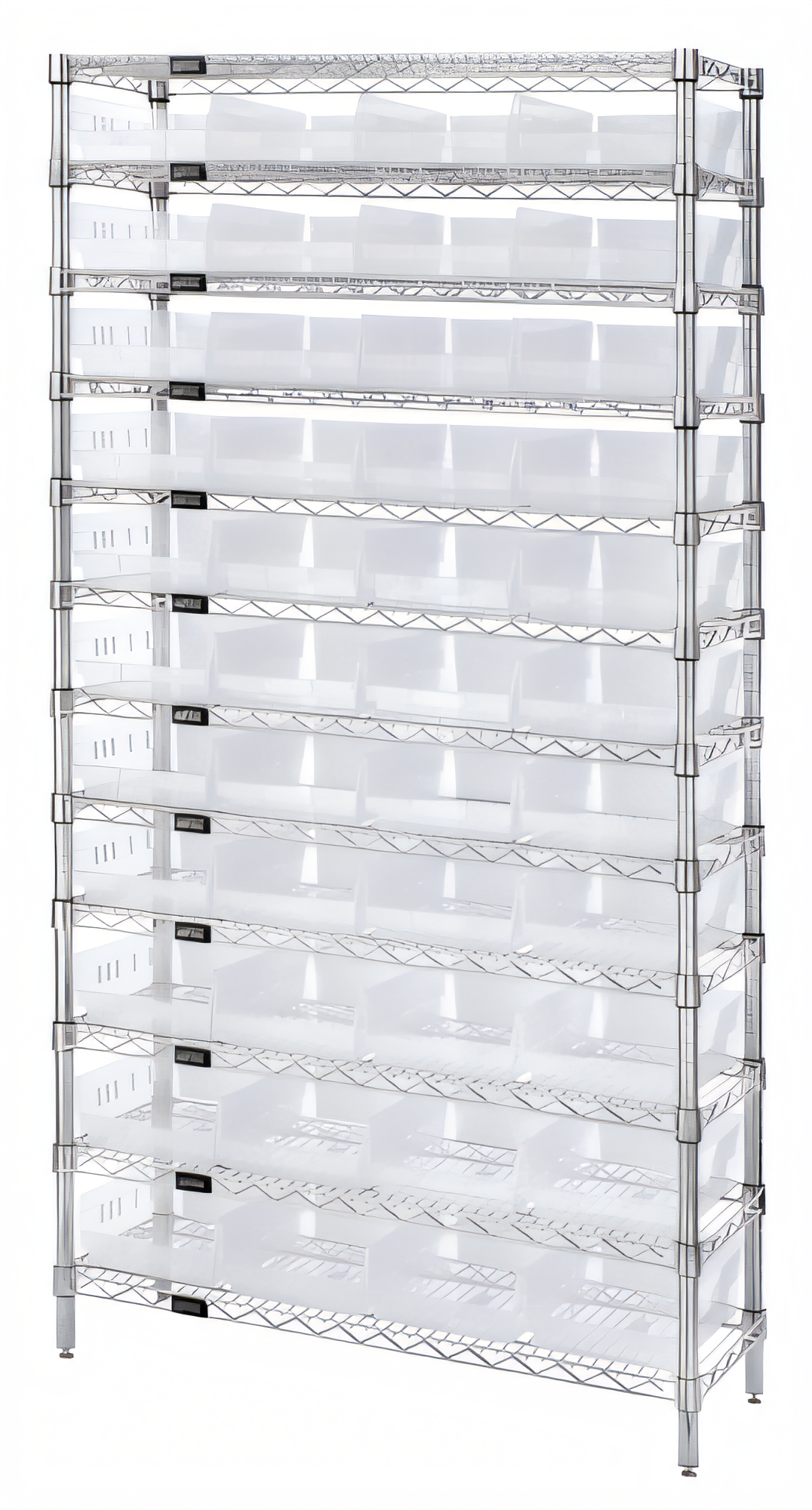 Bin Wire Shelving System, 36"W x 12"D x 74"H overall size, 800 lb. capacity per shelf, includes: (12) wire shelves, (4) posts, and (44) QSB107 clear bins, chrome plated finish