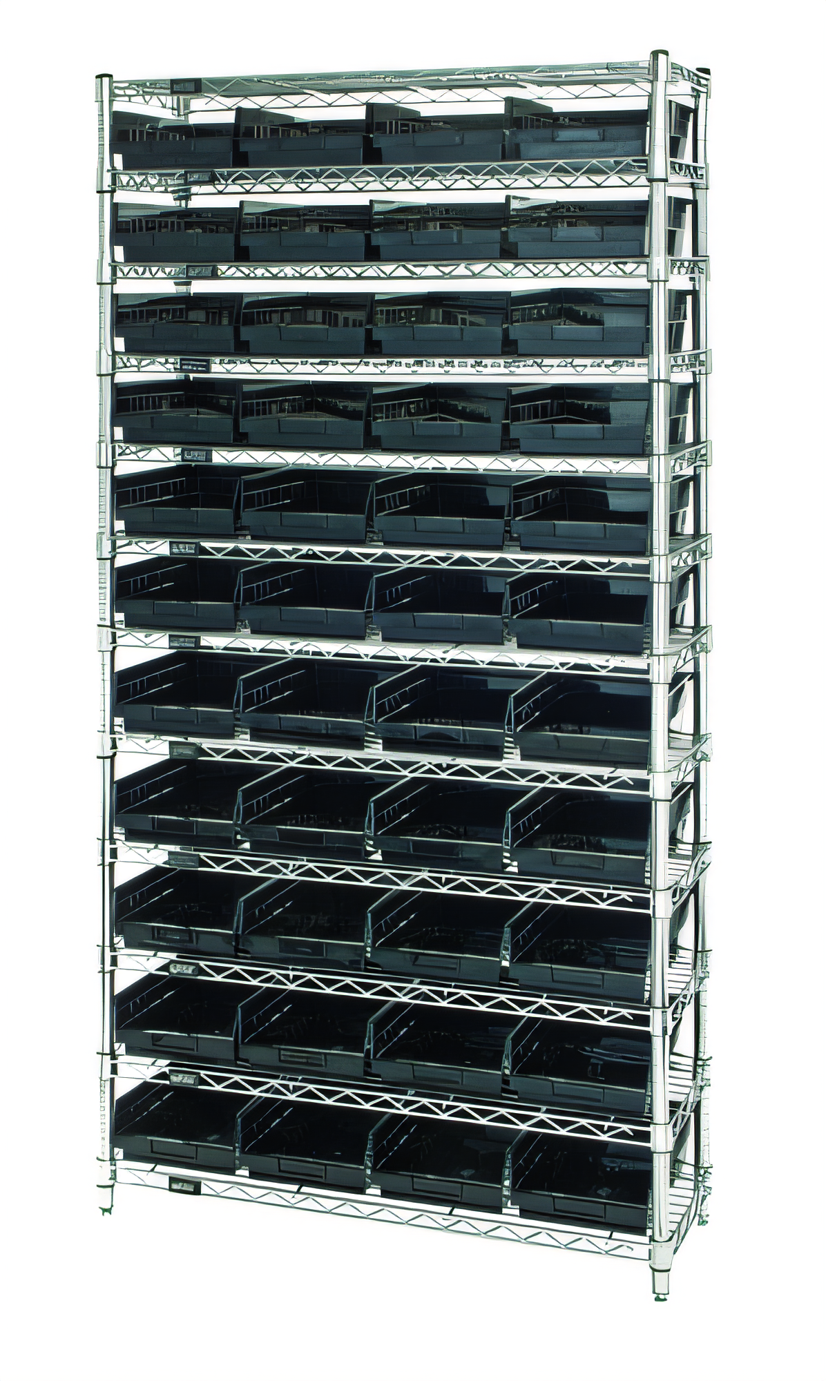 Complete 12-shelf kit with 44 QSB107 bins | 800 lb capacity per shelfOrganize, protect and quickly access small parts and electronic components with this all-in-one, ESD-safe storage solution from Quantum Storage Systems. The chrome-plated wire construction promotes air circulation and visibility, while the conductive shelves and bins help dissipate static charges when properly grounded.