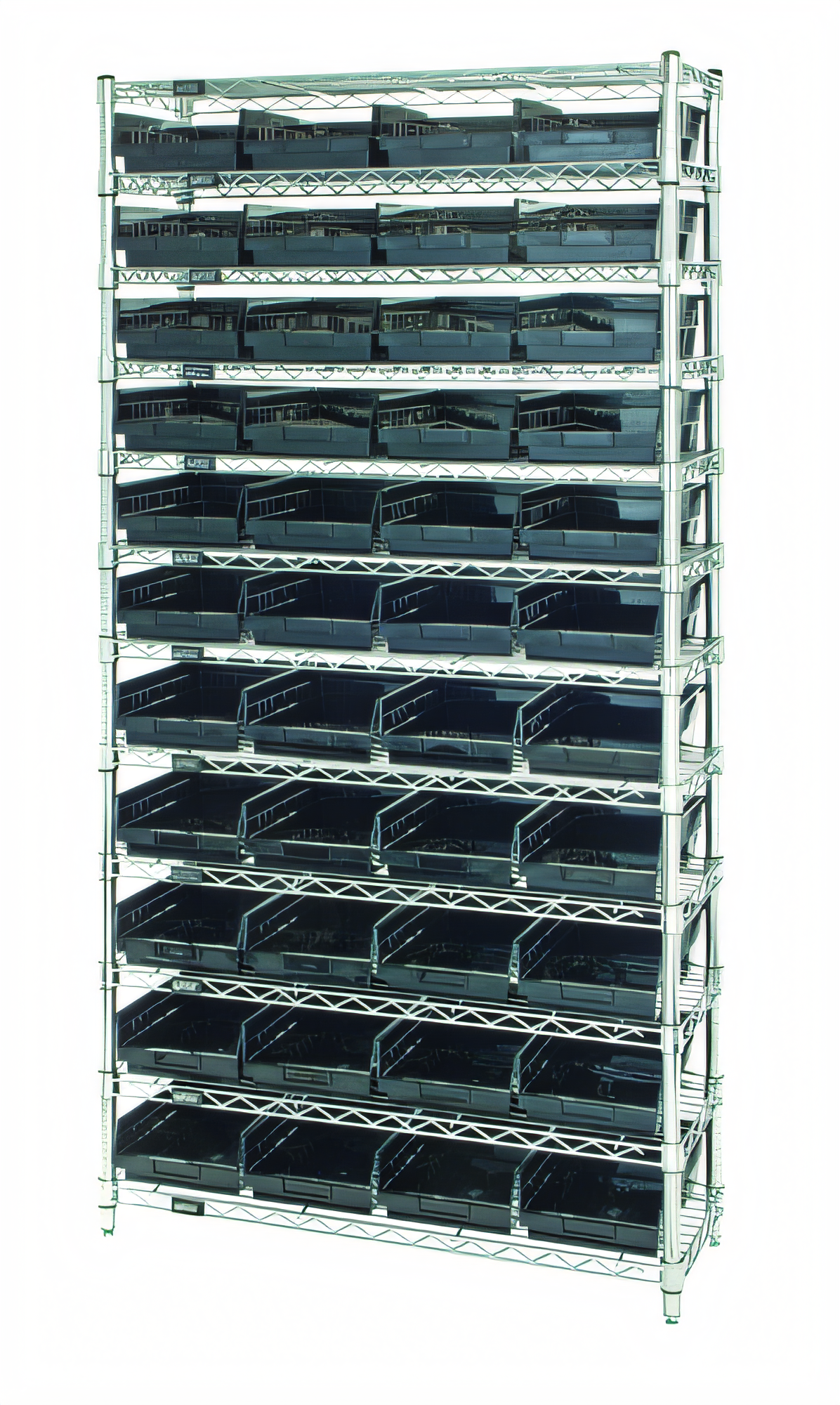 (12) Chrome Wire Shelves • (4) Posts • (44) QSB108 BinsBuilt for demanding, static-sensitive environments, this turnkey Quantum system pairs heavy-duty conductive wire shelving with high-capacity QSB108 storage bins. Twelve adjustable shelves deliver up to 9,600 lb of total capacity, while 44 color-coded bins keep components sorted, protected and within easy reach.