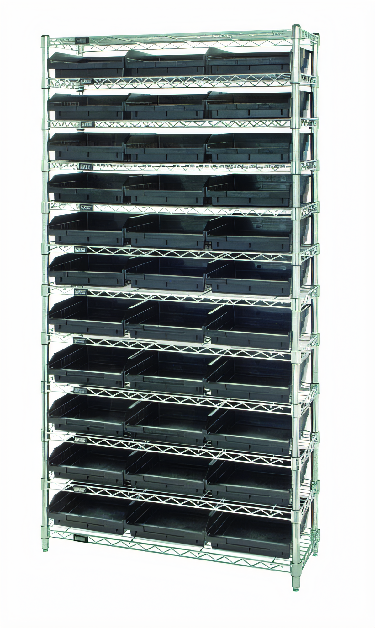 36" W × 24" D × 74" H | 12 Shelves | 33 QSB116 Bins | 800 lb Capacity / ShelfOrganize, protect and access sensitive components with Quantum’s complete conductive shelving solution. The chrome-plated, open-wire rack keeps air flowing and dust down, while the included QSB116 conductive bins safely dissipate static charges—perfect for electronics, labs and assembly lines.
