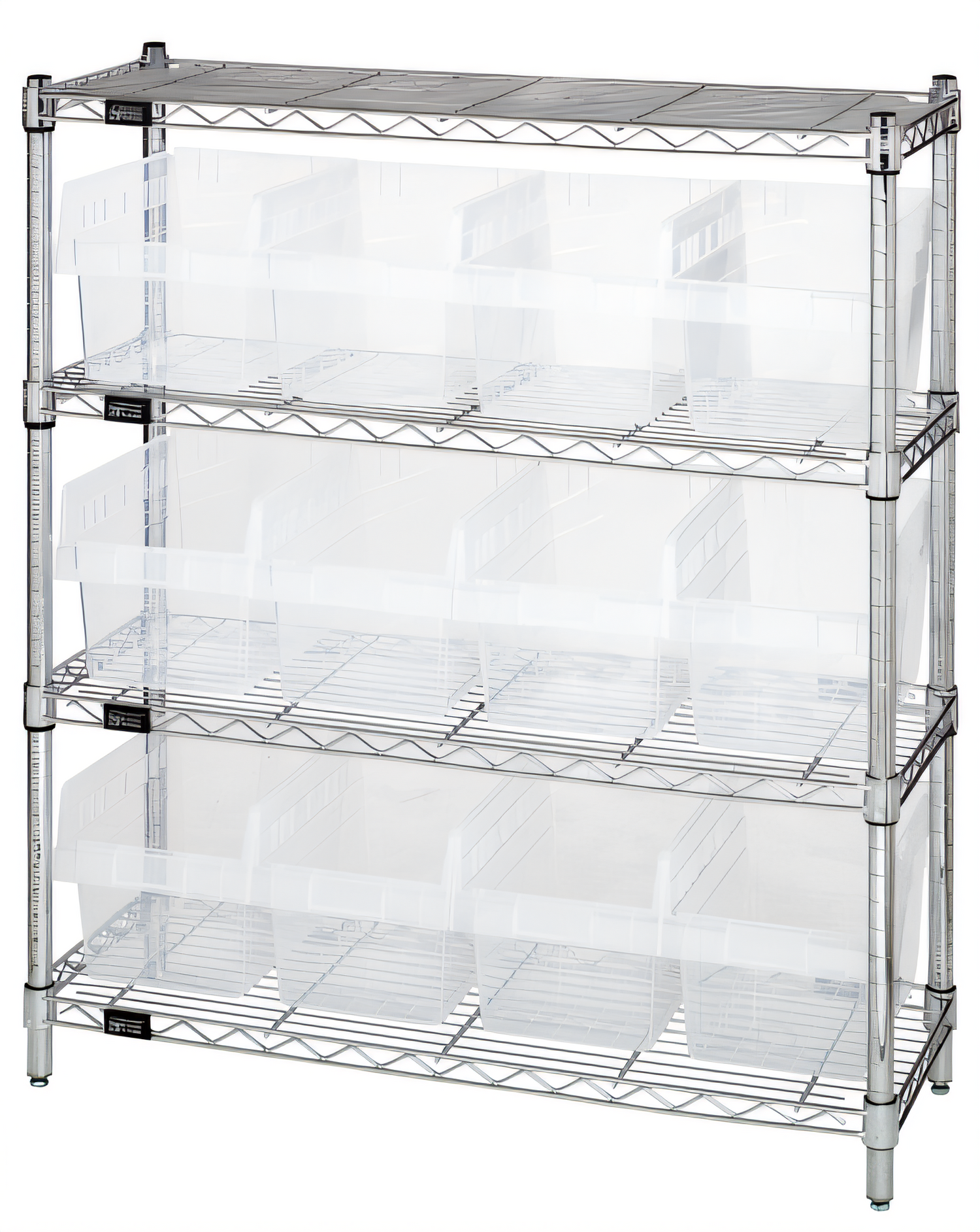 Bin Wire Shelving Center, 12"D x 36"W x 39"H, 800 lbs. capacity per shelf, includes: (4) shelves and (12) QSB807 clear bins, chrome plated finish, shipped KD