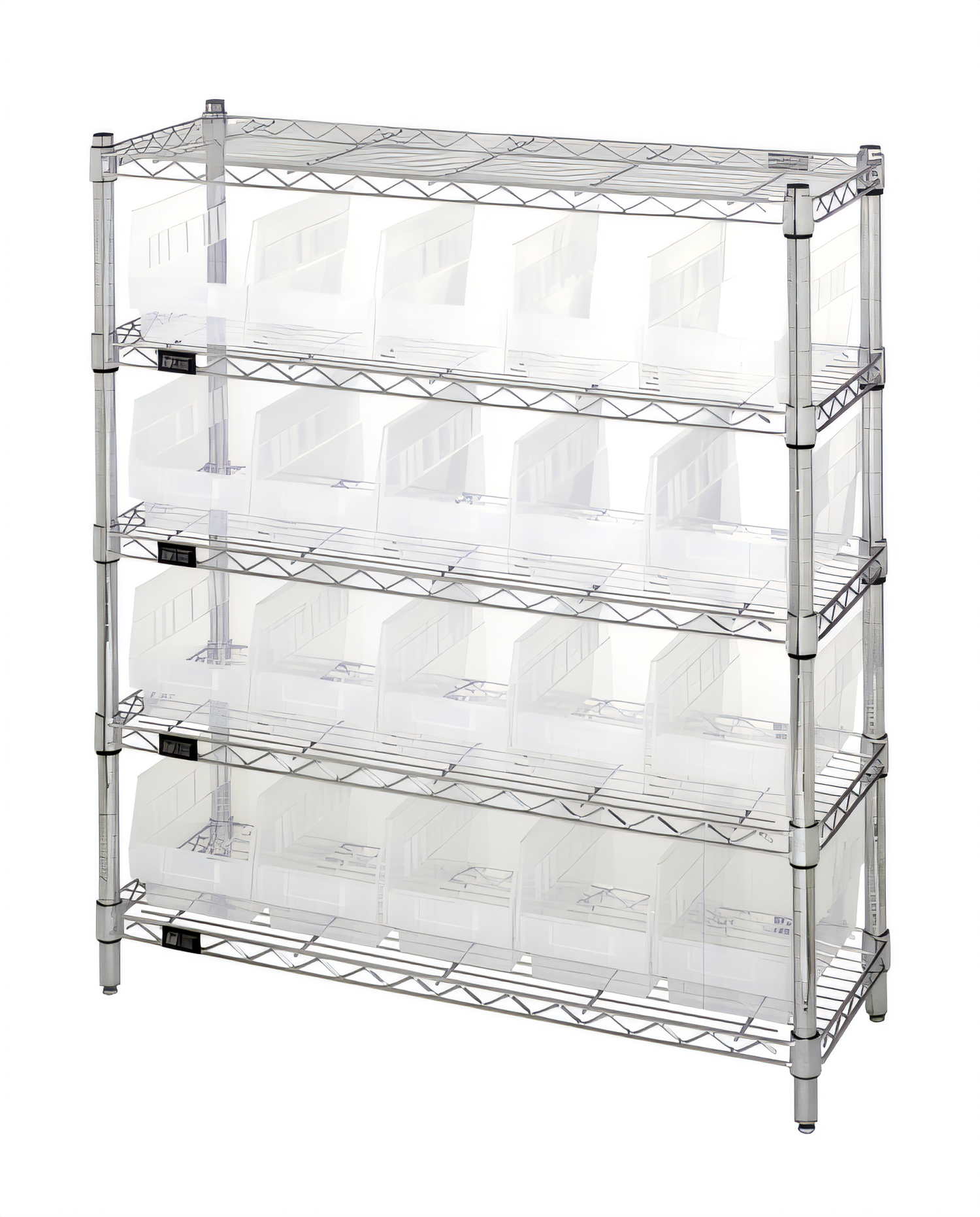 Bin Wire Shelving Center, 12"D x 36"W x 39"H, 800 lbs. capacity per shelf, includes: (5) shelves and (20) QSB202 clear bins, chrome plated finish, shipped KD