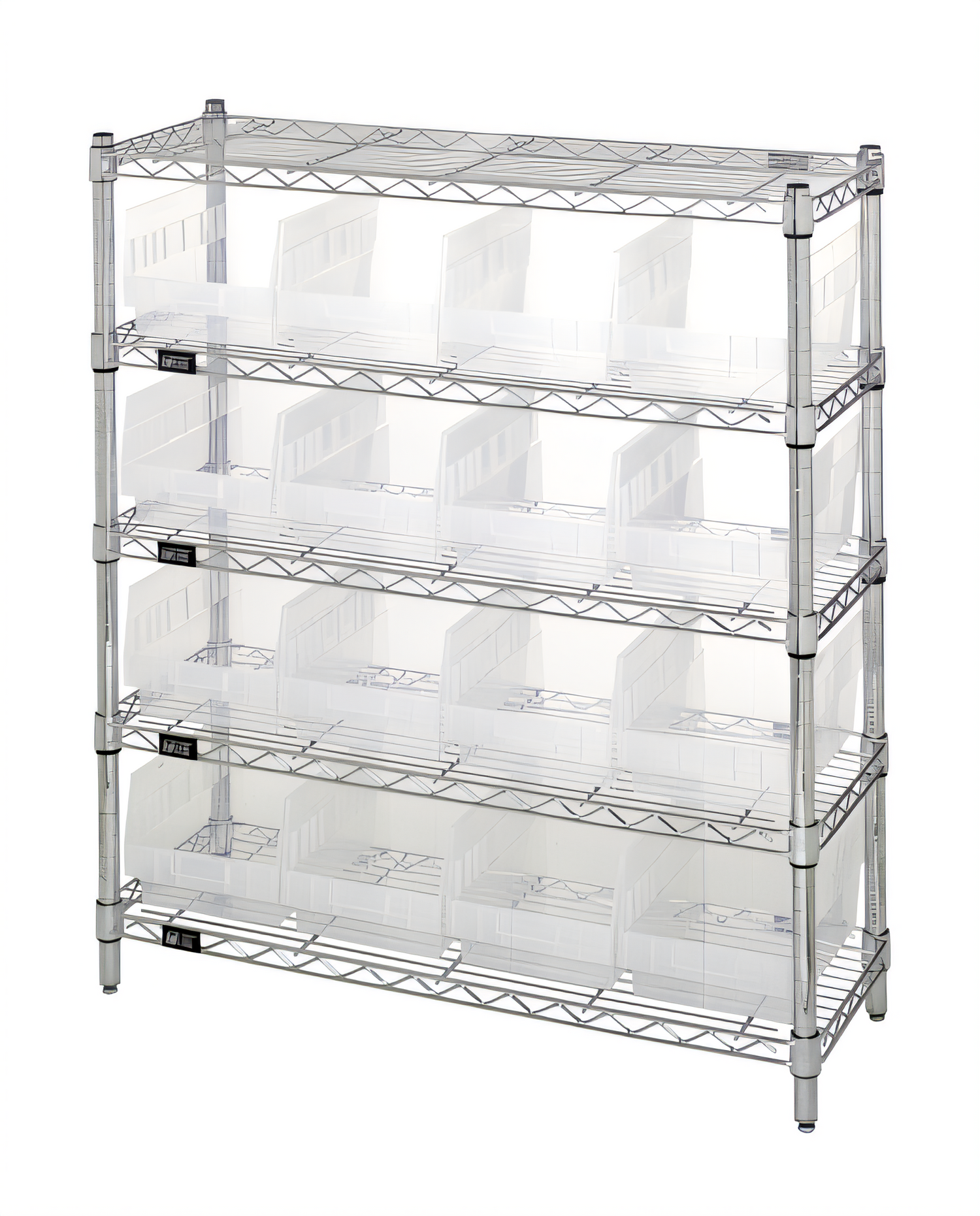 Bin Wire Shelving Center, 12"D x 36"W x 39"H, 800 lbs. capacity per shelf, includes: (5) shelves and (16) QSB207 clear bins, chrome plated finish, shipped KD
