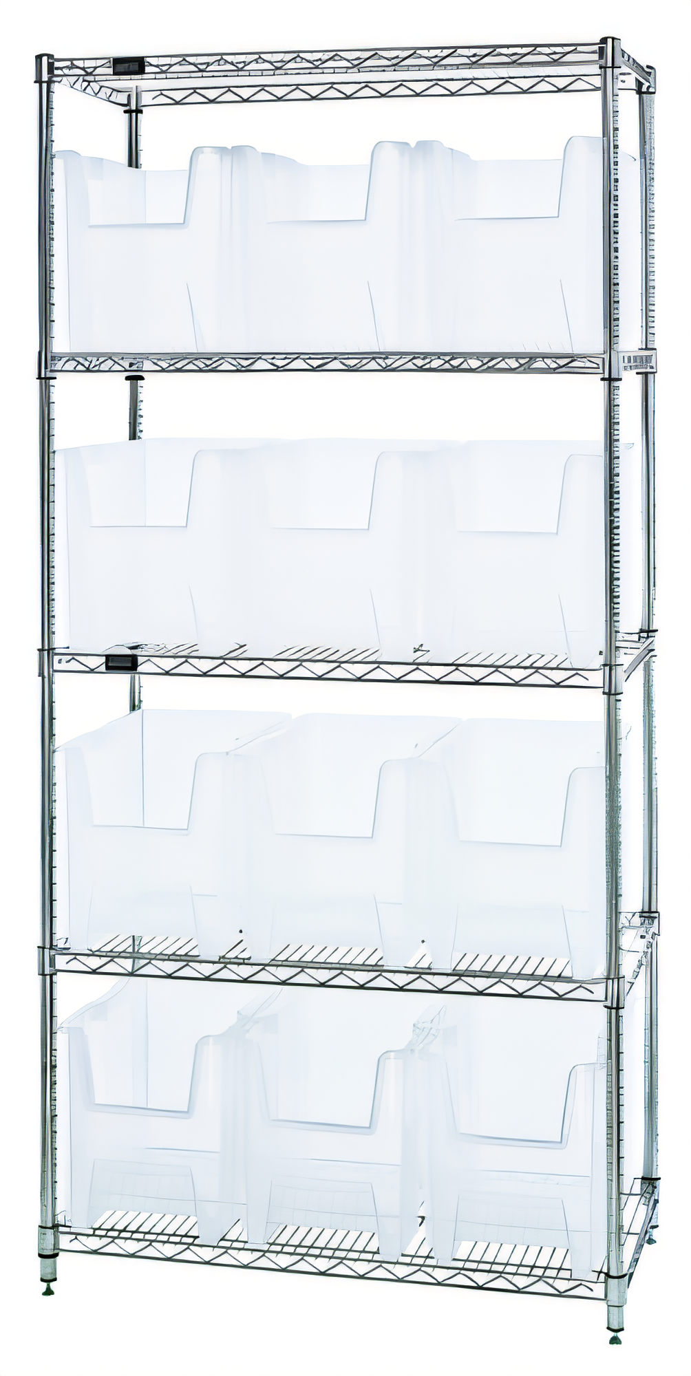 Bin Wire Shelving System, 36"W x 18"D x 74"H, 800 lbs. load capacity per shelf, includes: (5) shelves and (12) QGH600 clear bins, chrome plated finish, shipped KD