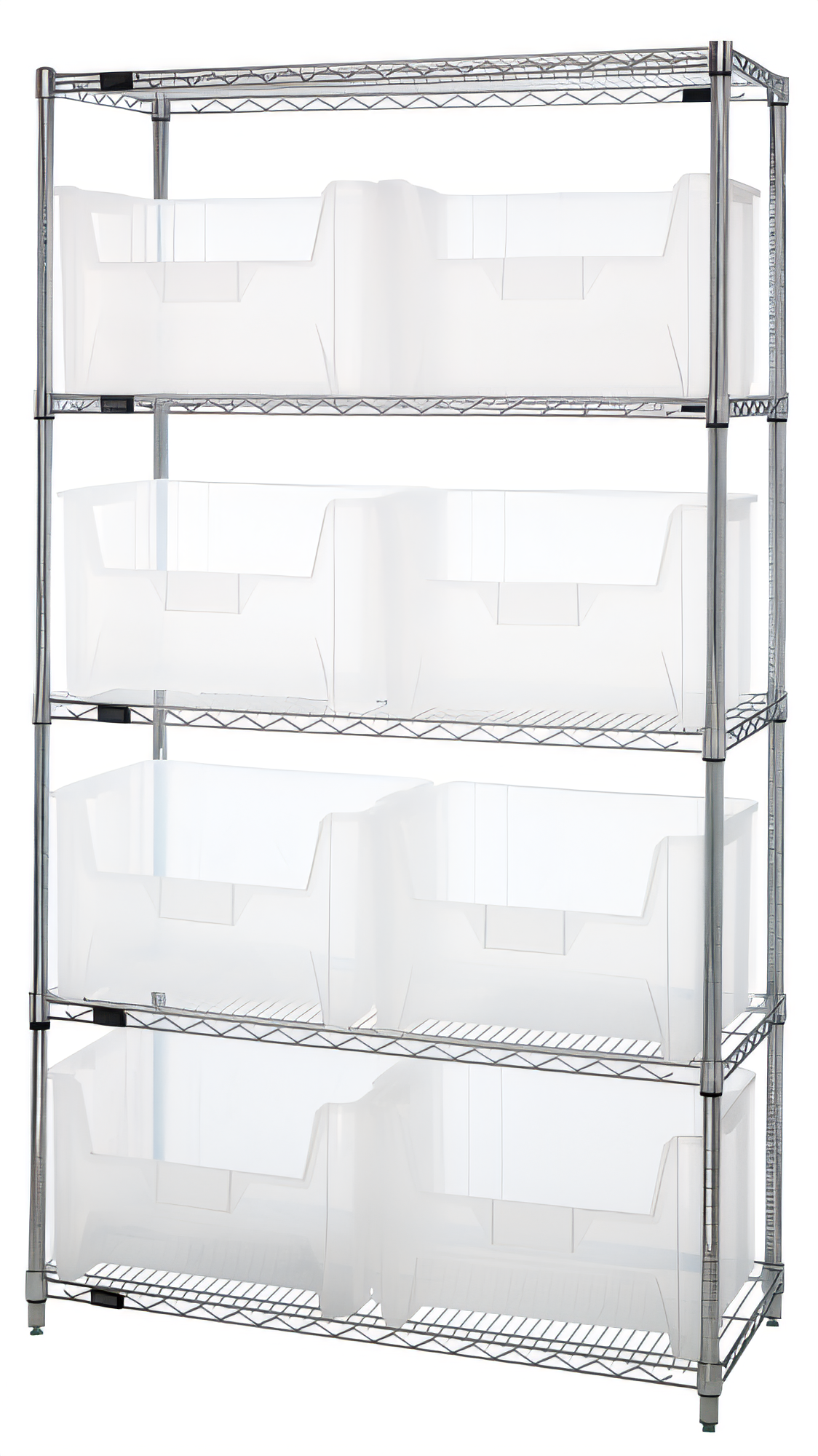 Bin Wire Shelving System, 42"W x 18"D x 74"H, 800 lbs. load capacity per shelf, includes: (5) shelves and (8) QGH700 clear bins, chrome plated finish, shipped KD
