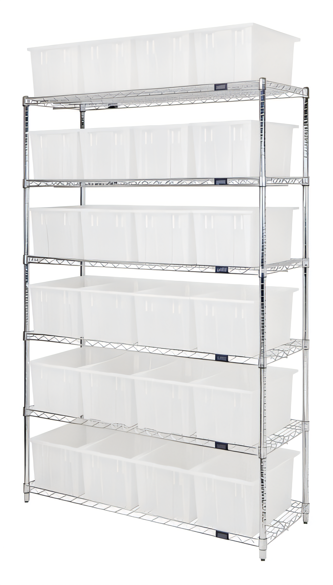 Bin Wire Shelving System, 48"L x 18"D x 74"H, 800 lbs. load capacity per shelf, includes: (6) shelves and (24) SNT185 clear containers, chrome plated finish, shipped KD