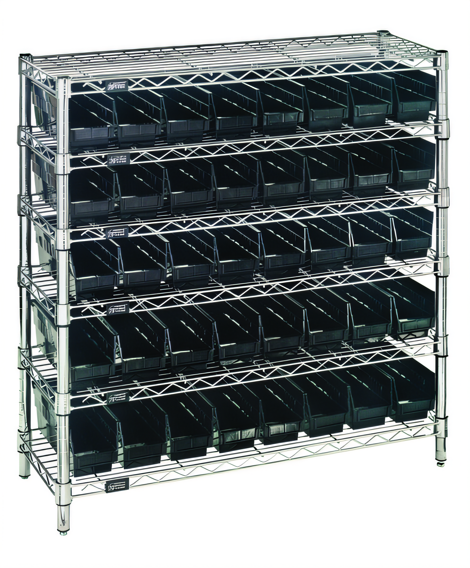 Bin Wire Shelving System, conductive, 36"W x 12"D x 36"H overall size, 800 lb. capacity per shelf, includes: (6) wire shelves, (4) posts, (40) QSB101 bins, chrome plated finish