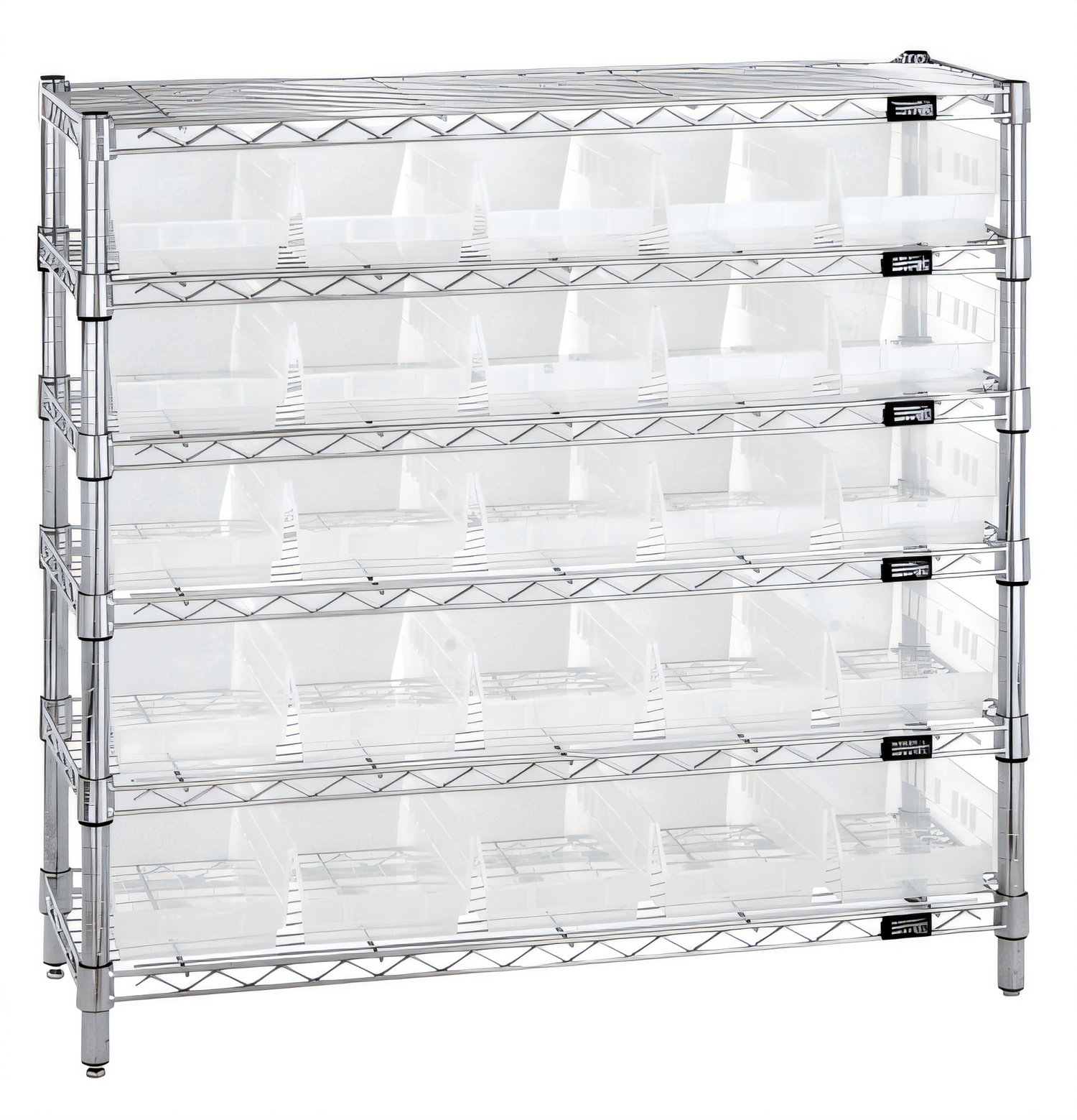 Bin Wire Shelving System, 36"W x 12"D x 36"H overall size, 800 lb. capacity per shelf, includes: (6) wire shelves, (4) posts, (25) QSB102 clear bins, chrome plated finish