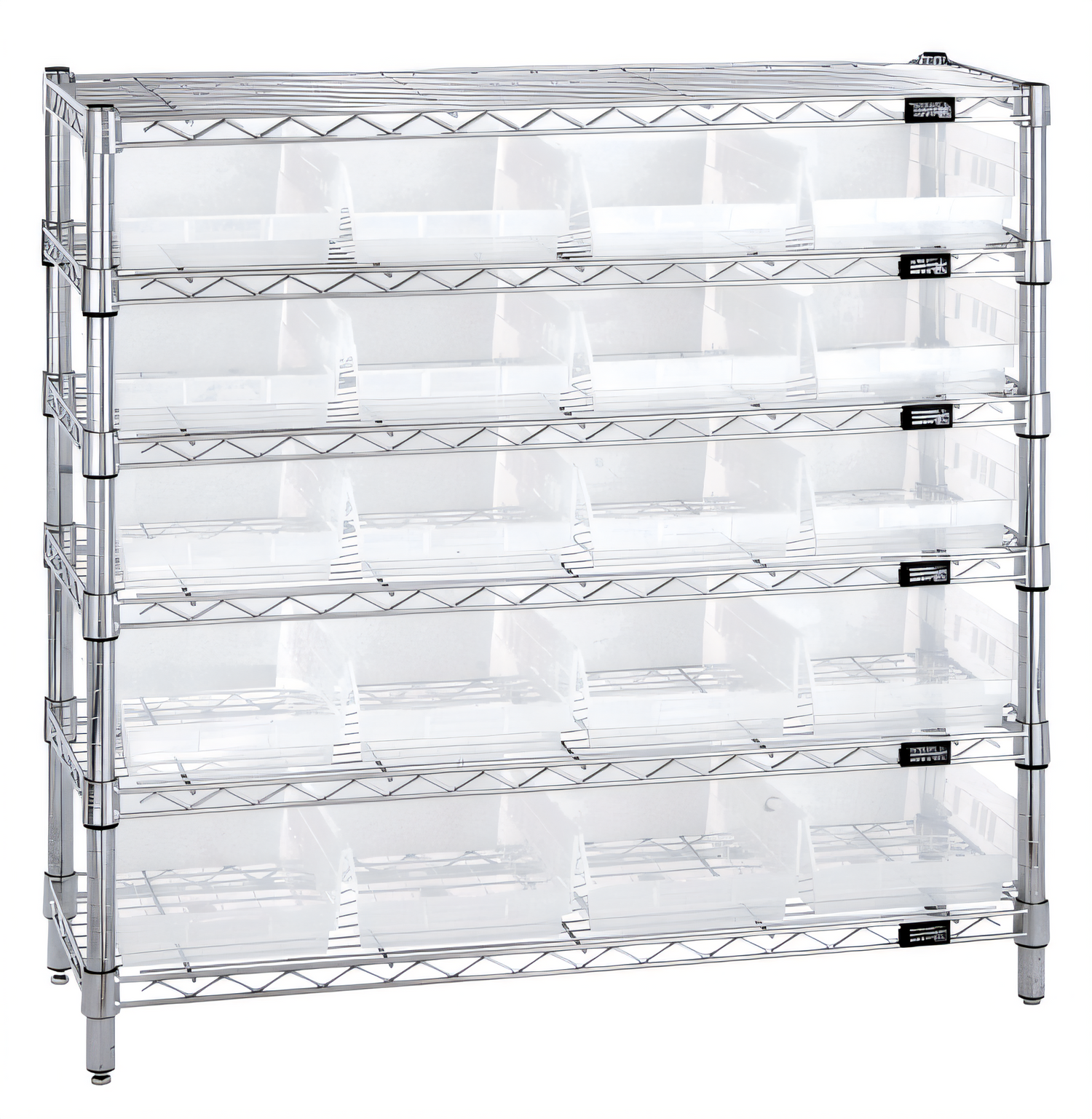 Bin Wire Shelving System, 36"W x 12"D x 36"H overall size, 800 lb. capacity per shelf, includes: (6) wire shelves, (4) posts, (20) QSB107 clear bins, chrome plated finish