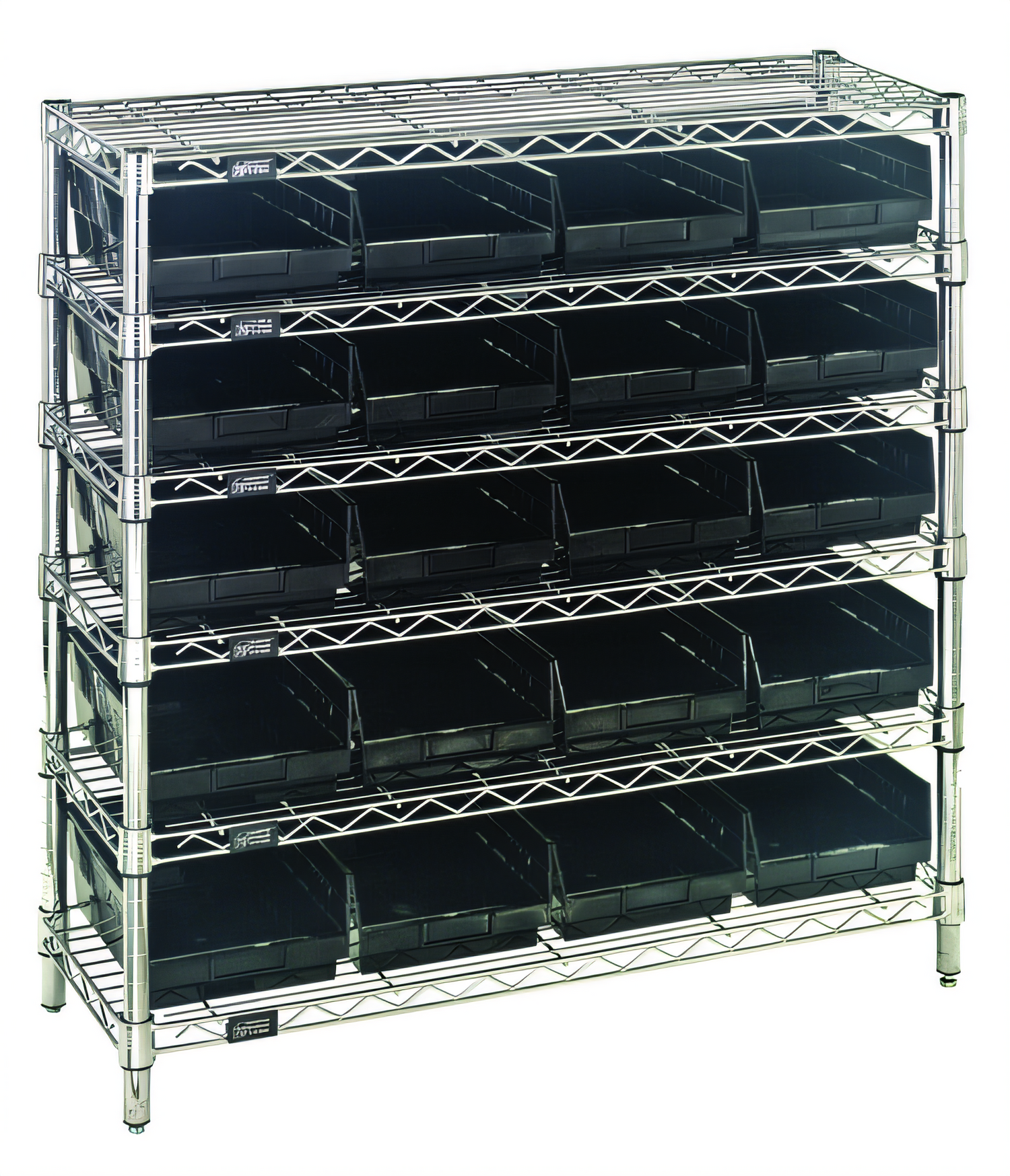 Bin Wire Shelving System, conductive, 36"W x 12"D x 36"H overall size, 800 lb. capacity per shelf, includes: (6) wire shelves, (4) posts, (20) QSB107 bins, chrome plated finish