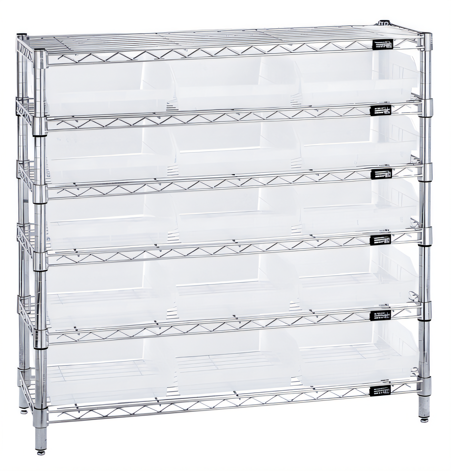 Bin Wire Shelving System, 36"W x 12"D x 36"H overall size, 800 lb. capacity per shelf, includes: (6) wire shelves, (4) posts, (15) QSB109 clear bins, chrome plated finish