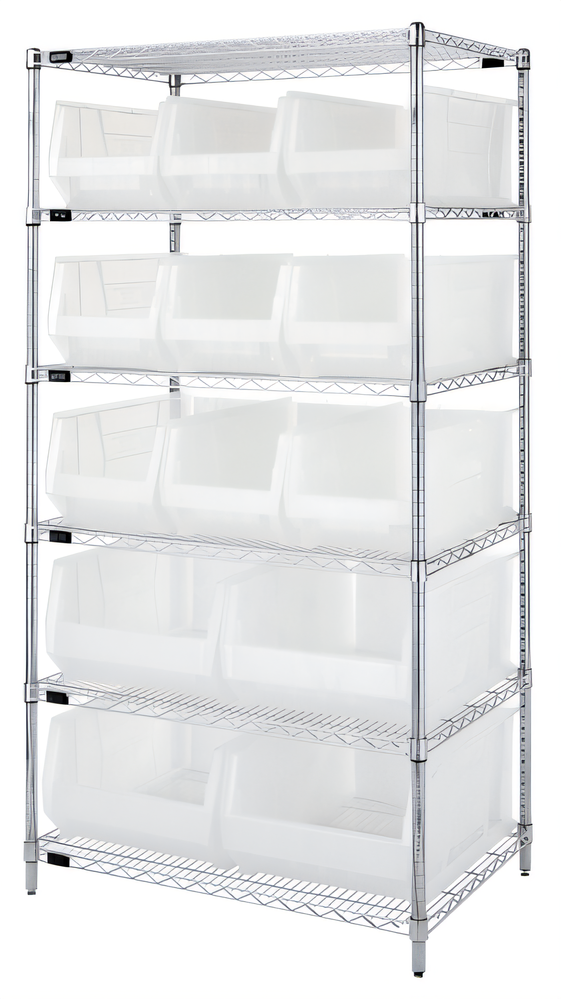 Bin Wire Shelving System, 36"W x 24"D x 74"H overall size, 800 lb. capacity per shelf, includes: (6) wire shelves, (4) posts, (9) QUS953 and (4) QUS954 clear bins, chrome plated finish