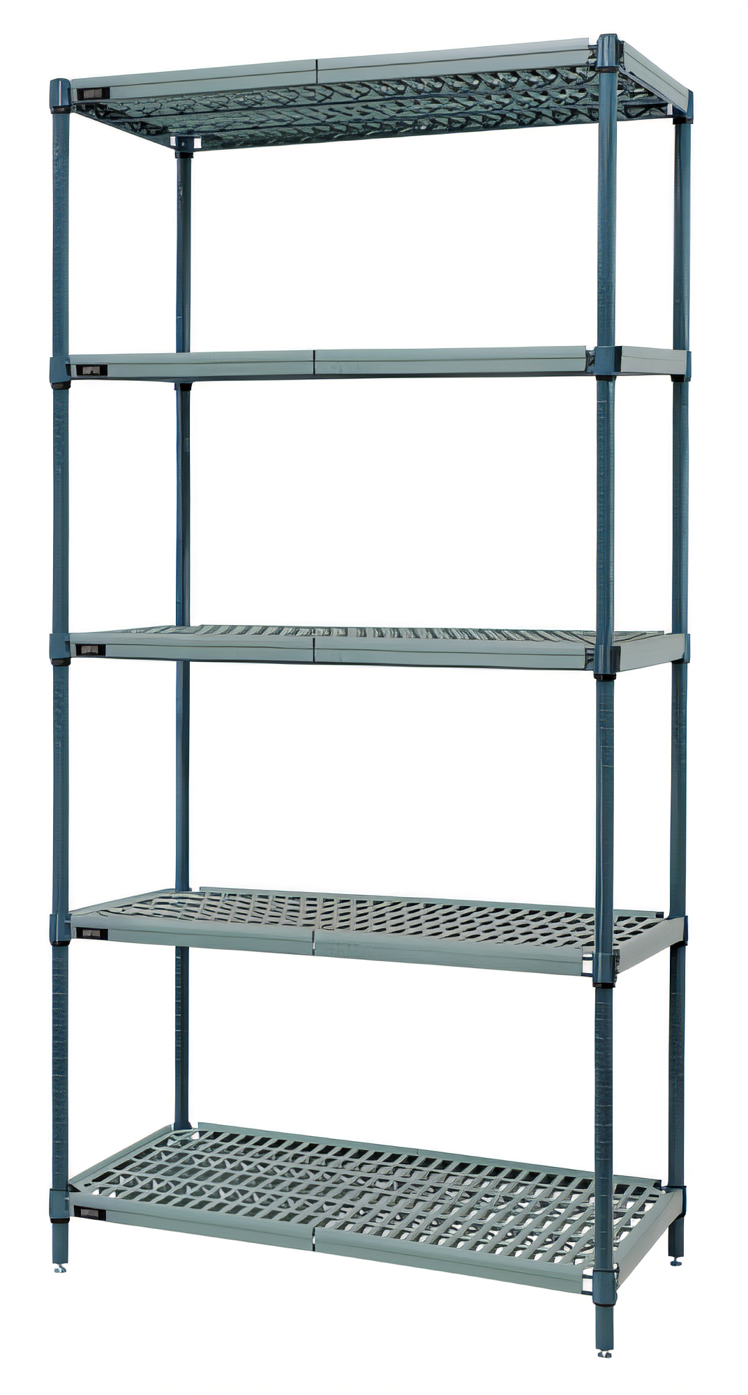 Wire Plastic Mat Shelving Unit, stationary, 5-tier, 24"W x 18"D x 63"H overall size, 600-800 lb. max weight, includes, (5) plastic wire mats, (5) wire frames, (4) posts, & packs of split sleeves, green epoxy antimicrobial coating, NSF, KD