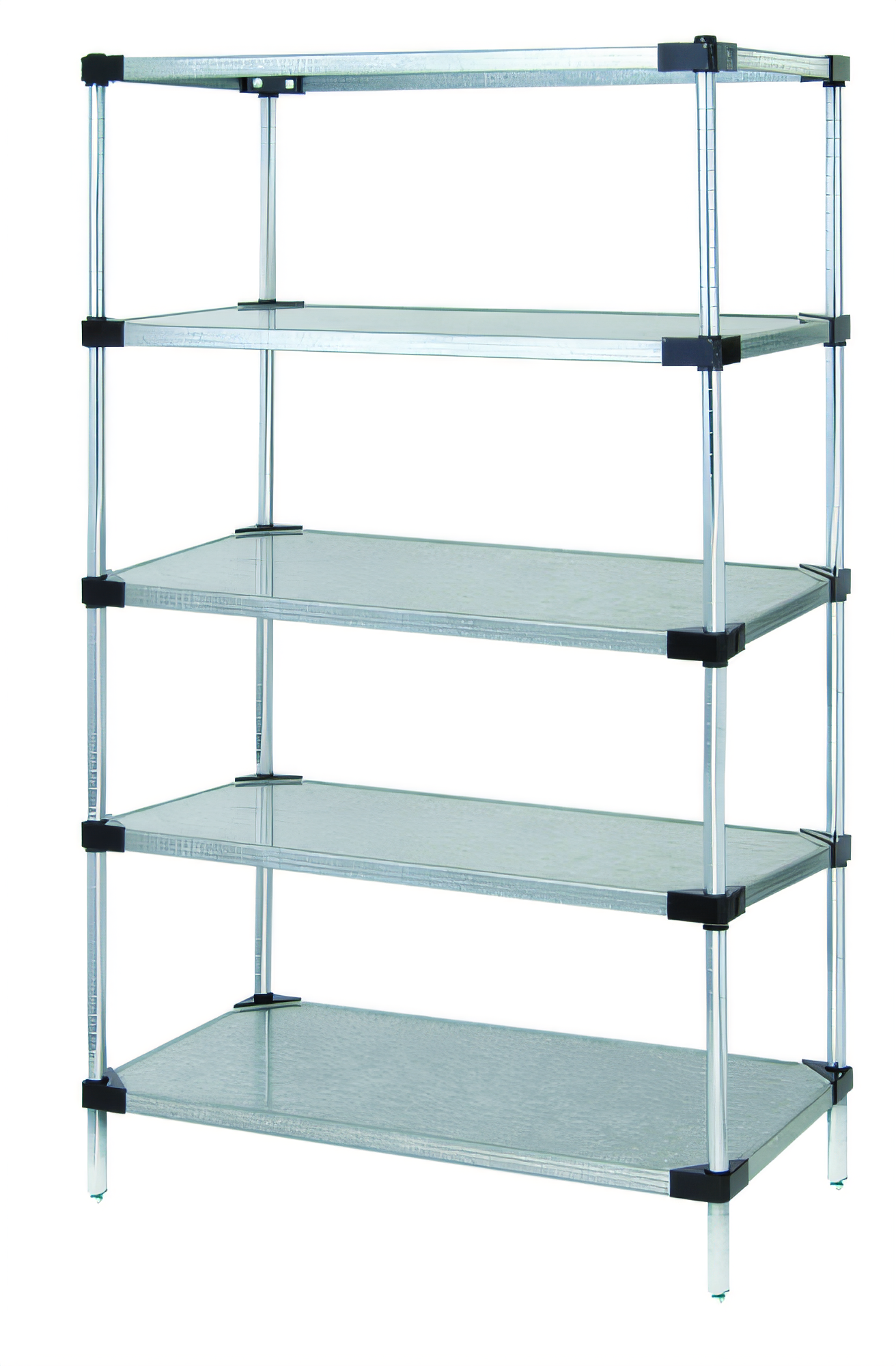 Solid Shelving Starter Kit, 42"W x 14"D x 74"H, includes (5) solid shelves and (4) posts, galvanized steel shelves and chrome posts finish, NSF, shipped KD