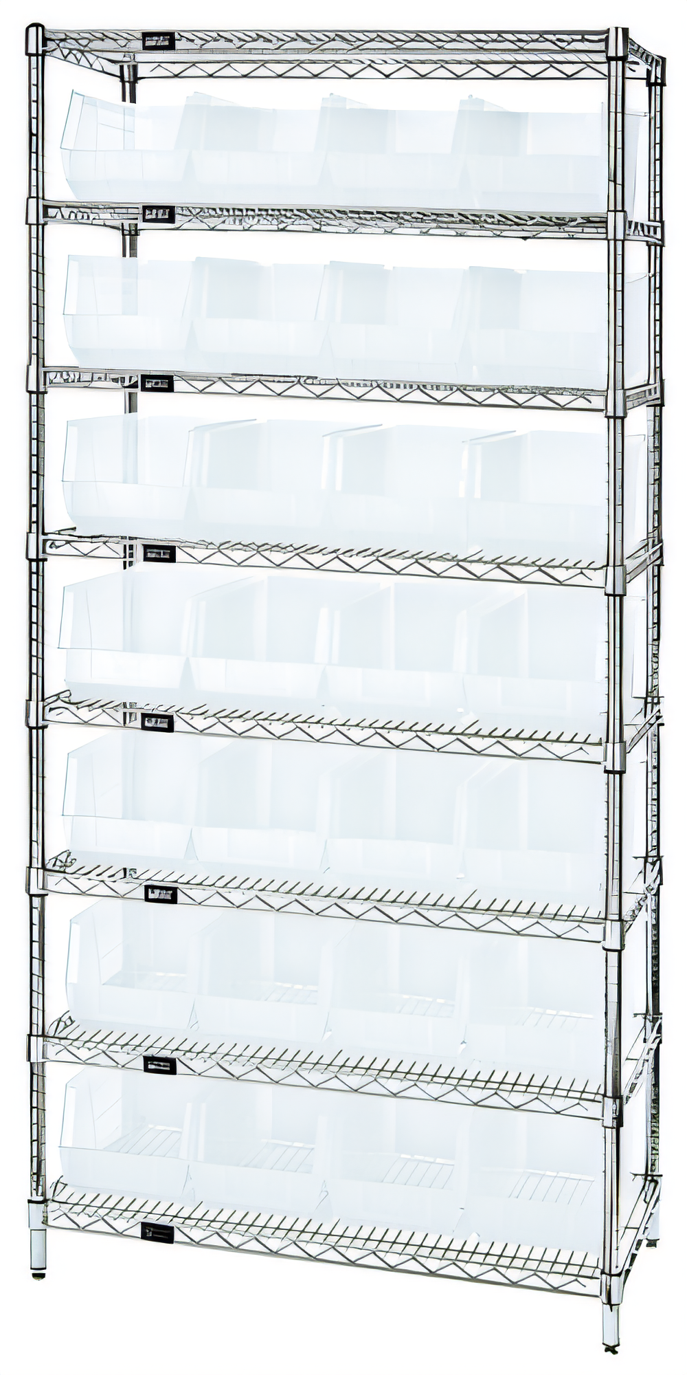 Bin Wire Shelving System, 36"W x 14"D x 74"H, 800 lbs. load capacity per shelf, includes: (8) shelves and (28) QUS240 clear bins, chrome plated finish, shipped KD