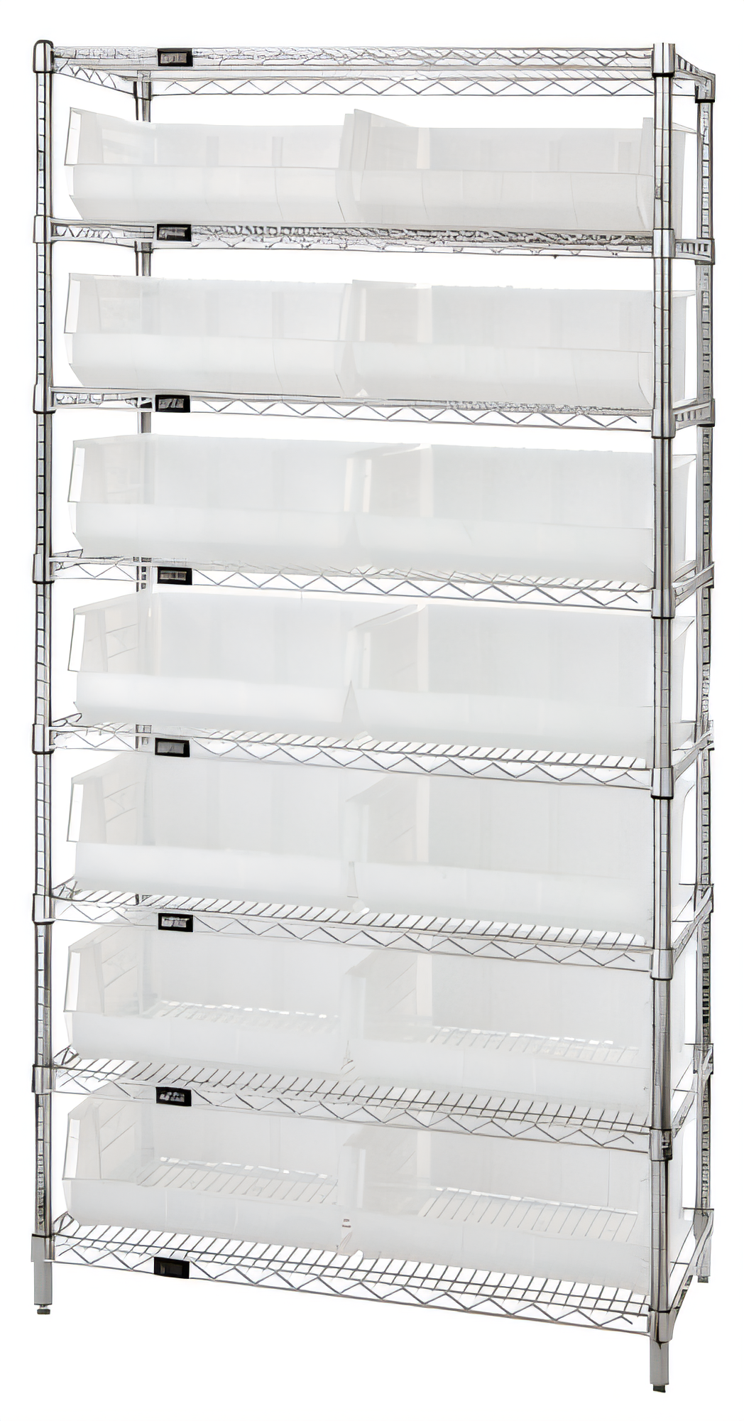 Bin Wire Shelving System, 36"W x 14"D x 74"H, 800 lbs. load capacity per shelf, includes: (8) shelves and (14) QUS250 clear bins, chrome plated finish, shipped KD