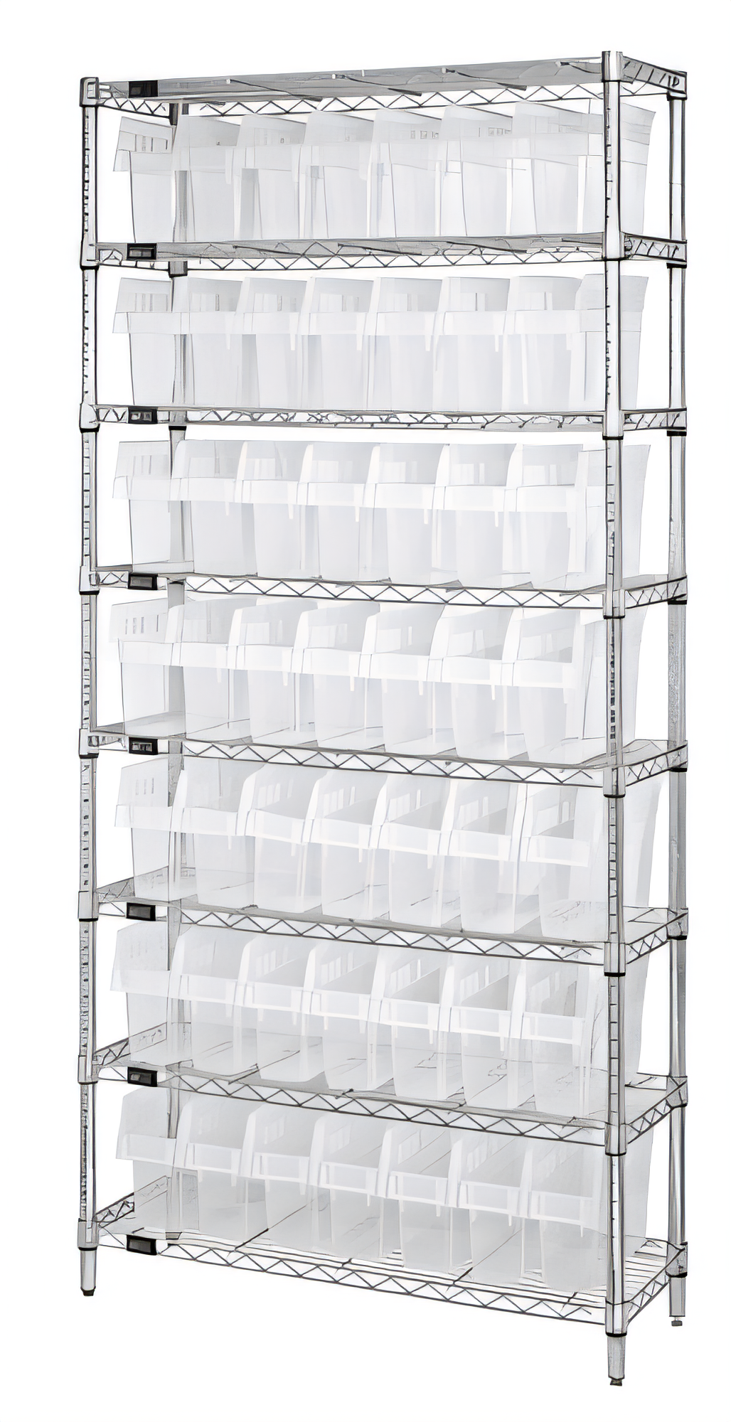 Quantum Storage Systems • Chrome Finish • 800 lb Capacity per ShelfOrganize small-to-medium parts, supplies or retail inventory in one space-saving, heavy-duty station. This all-in-one Quantum wire unit ships complete with eight chrome shelves, four posts and forty-nine crystal-clear QSB805 storage bins—so you can unbox, assemble and put it to work in minutes.