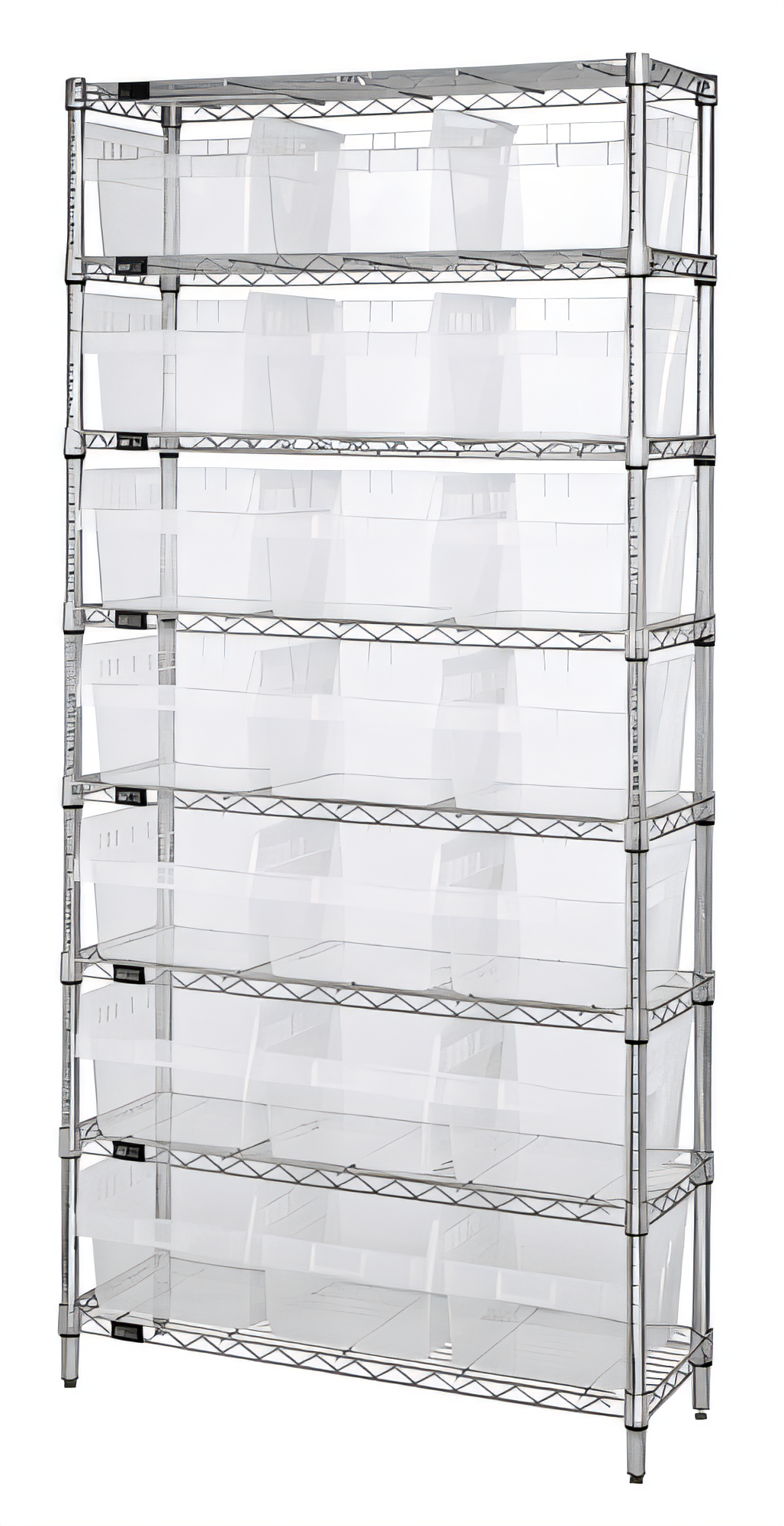 Quantum Storage • Chrome Plated • 800 lb capacity per shelfOrganize, see and access your small-to-medium parts faster with Quantum’s complete Bin Wire Shelving System. Eight heavy-duty chrome wire shelves team up with twenty-one crystal-clear QSB816 bins so you can build a clean, high-density storage station that’s ready for warehouses, stockrooms, labs or retail back-of-house.